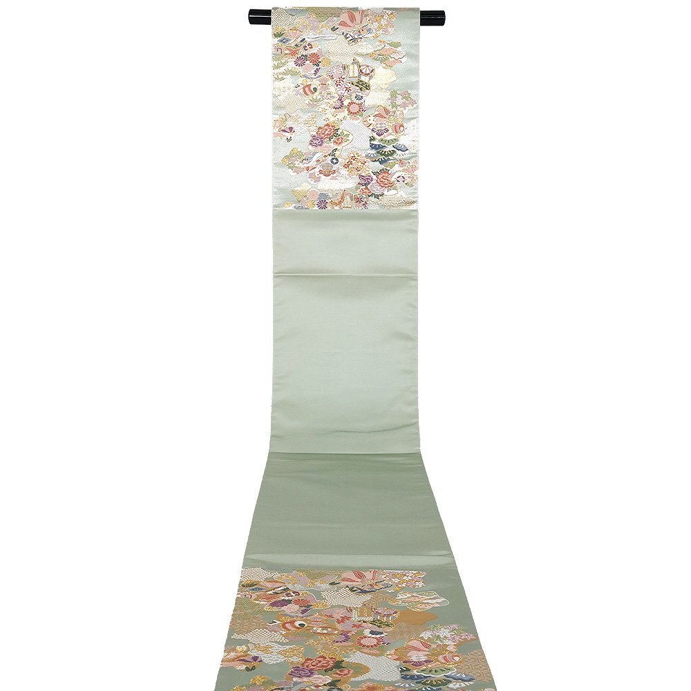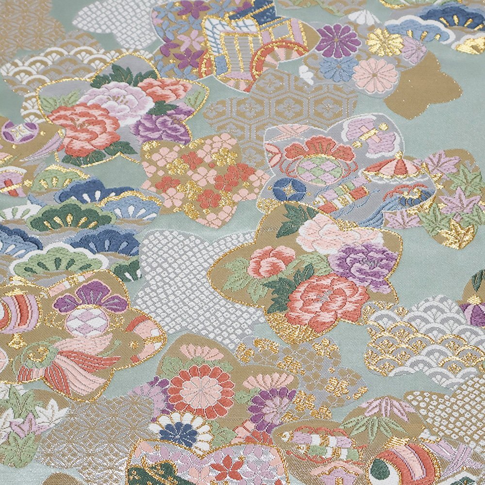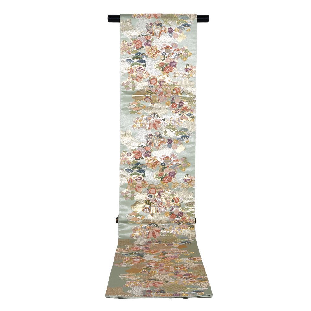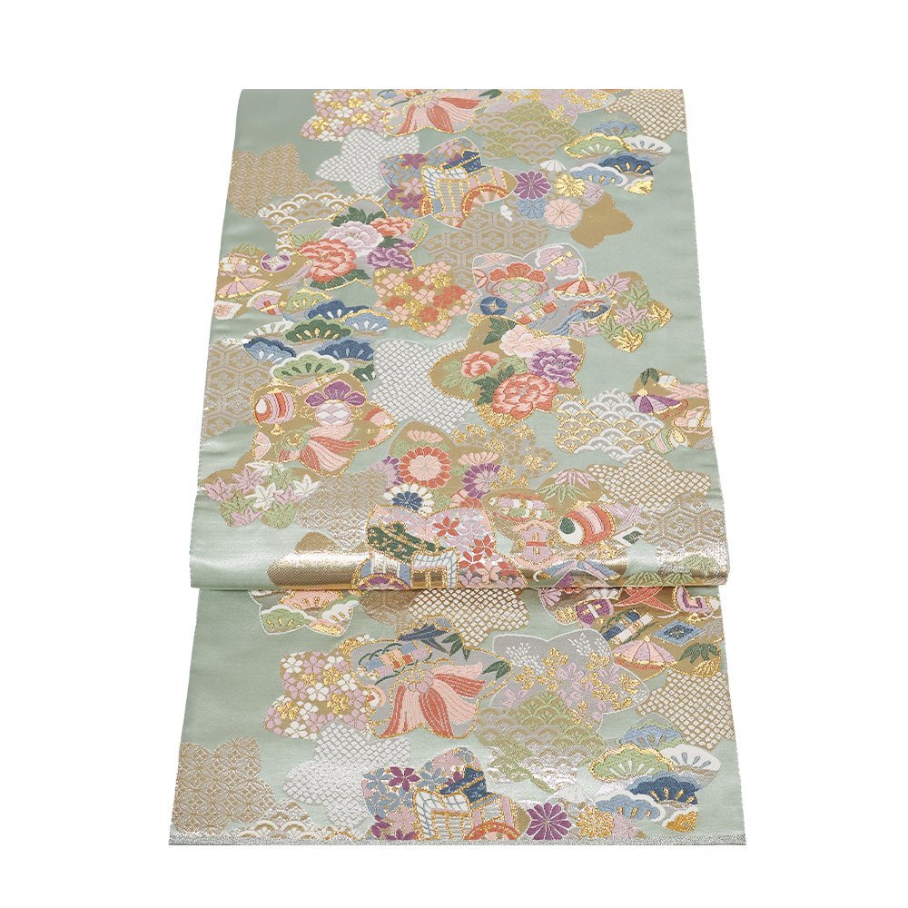 | 西陣織袋帯 江戸千代紙 緑箔・金箔・銀箔地 桜文 宝尽くし・桜・牡丹・菊・松竹梅・紅葉 仕立て上がり |