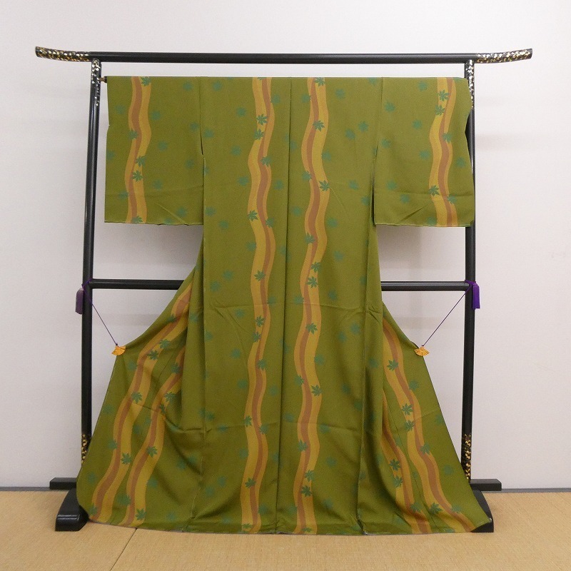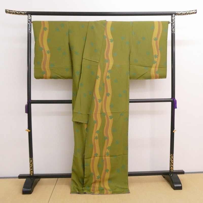 ◆小紋着物/丹後ちりめん/植物柄/新品/未仕立て/正絹/(梱包サイズ:80)◆* コメント・全体的に薄汚れ・薄い色ヤケがあります。 ・新品ですが、経年保存されていたお品ですので、ご理解のある方のご入札をお願い致します。 ・仮縫い状態ですので、着用にはお仕立てが必要です。当店でもお仕立てを受け賜わっております。お仕立て代は下記の「お仕立て価格表」をご参考ください。 ・ ・ * 品質・サイズ -- 着物サイズ目安 -- ・身丈・約169cm、袖丈・約56cm、裄・約69cm ・表・抹茶色 八掛・薄紫色 ・ ・※一部商品のみのお取引はお断り致しております。入札前・落札後に一部の商品のみのお取引交渉や発送方法(メール便等利用)の交渉はご遠慮下さい。サイズ・発送詳細を必ずご確認のうえ、ご理解・ご納得のうえでのご入札をお願い致します。 ・梱包サイズ:80サイズ(発送詳細必読) * 程度 当社基準ランク・・・【4】