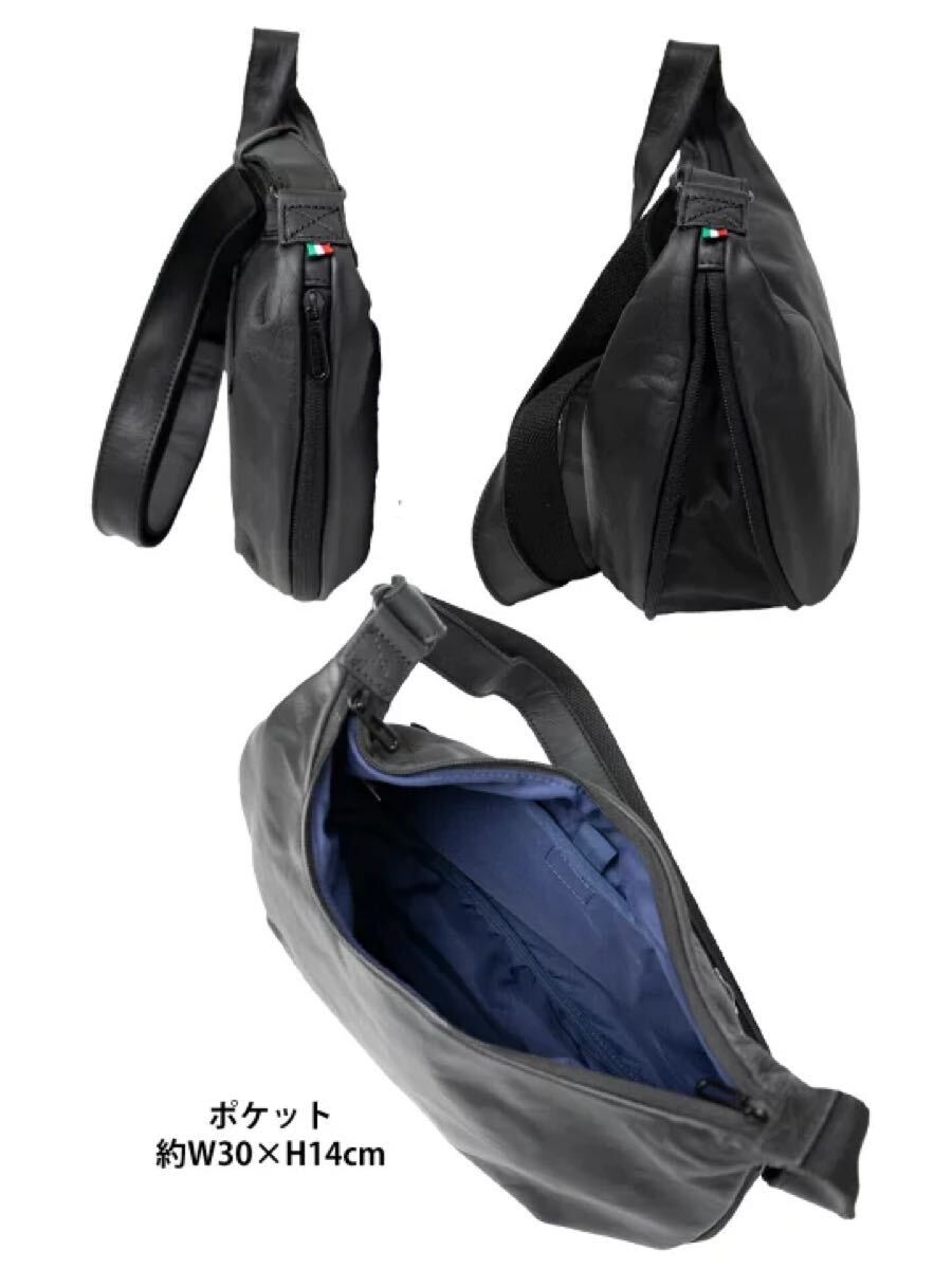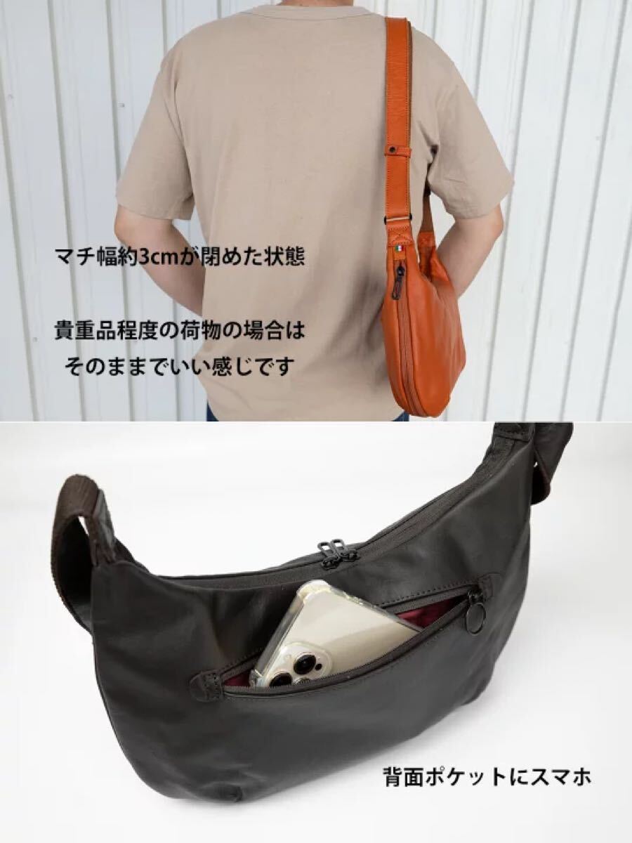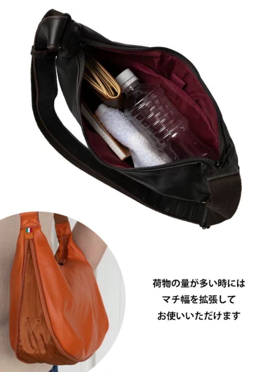 ●横型でスリムなので、前後どちら向きに斜めがけにしても収まりがよく快適かつかっこよくお持ちいただけます。