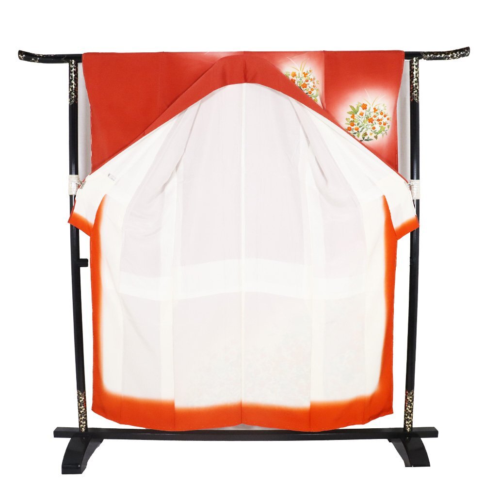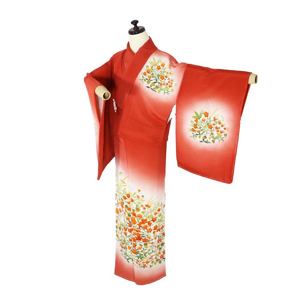 | 友禅 縮緬訪問着 袷 丹後縮緬地 赤(赤色)暈し地 草花 162 広襟 7号 一つ紋 仕付け付き |