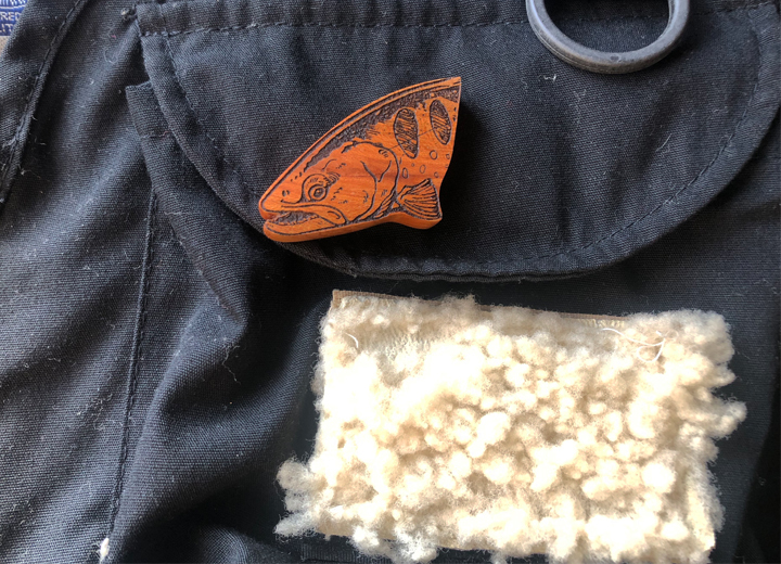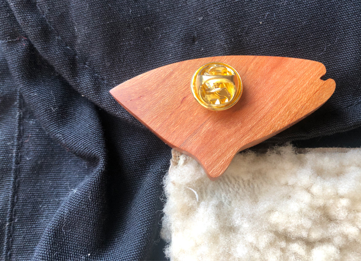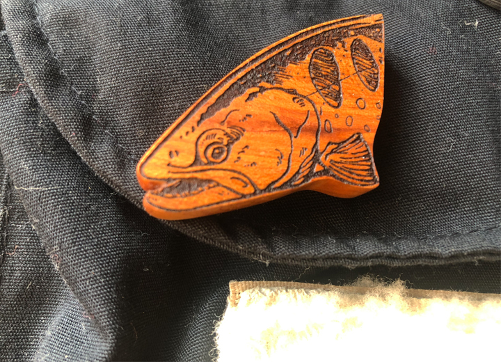 ヤマメ彫刻 ピンバッチ 山桜 銘木 ヤマサクラ トラウト 毛鉤 ヤマメ 渓流 テンカラ フライ アクセサリー フライ小物