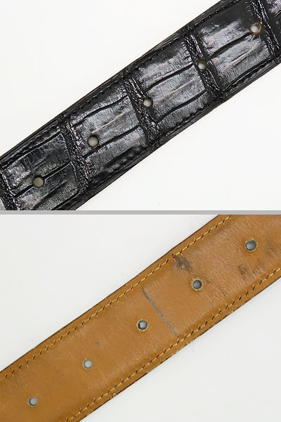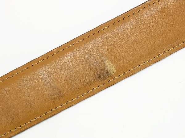 バックル金具に薄キズ・小キズ、ベルトレザーに多少のスレや薄キズ・若干のヨレがございますが、大きなダメージはなくまだまだご愛用いただけるお品物になります。 ※調節穴を2箇所増設されています。 |