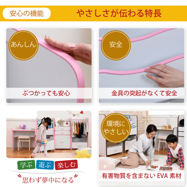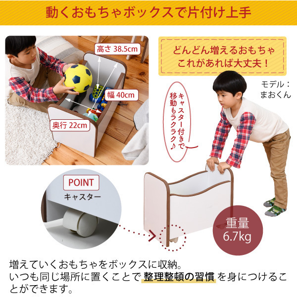 商品説明 | 弾力性、衝撃吸収に優れたEVA樹脂をすべてのフチに採用。 さらに角を丸くして金具の使用を極力減らした、小さなお子様も安全にご使用いただけるシリーズです。 表紙が見えるので、探している絵本も簡単に探せます。 キャスター付きのおもちゃBOXは、お気に入りのおもちゃを入れてもお子様の力で簡単に移動可能。 【仕様】 ■本体サイズ [外寸] (本体)幅48×奥行30×高さ91cm (おもちゃBOX)幅43.5×奥行27×高さ38.5cm ■その他サイズ [内寸] (各絵本棚)幅44×奥行7×高さ17~20cm (おもちゃBOX)幅40×奥行22×高さ31~34.5(有効41.5)cm ■材質 [本体]プリント紙化粧合板 [フチ]EVA樹脂 ■収納量・耐荷重 [絵本棚]各約5kg以下 [ラック]約15kg以下 ■備考 ・背面化粧有り ・ラックにキャスター4個 ■生産国 中国 ■組立時間(目安)(大人2人) お客様組立(60分) ■キーワード おもちゃ収納 おもちゃラック トイボックス おもちゃBOX おもちゃ箱 オモチャ箱 収納ボックス 片付け かたづけ 子供収納 子供部屋 子ども キッズ 木製棚 整理棚 人気 ラック シェルフ 薄型 カラフル 見せる収納 隠す収納 ラック スリム収納 収納 棚付絵本ラック ファミリー リビング おしゃれ かわいい ジュニア家具 キッズ家具 安全 安心 キッズ本棚 おもちゃ箱 マガジンラック 絵 本棚 木製 絵本 立て たて 男の子 女の子 |