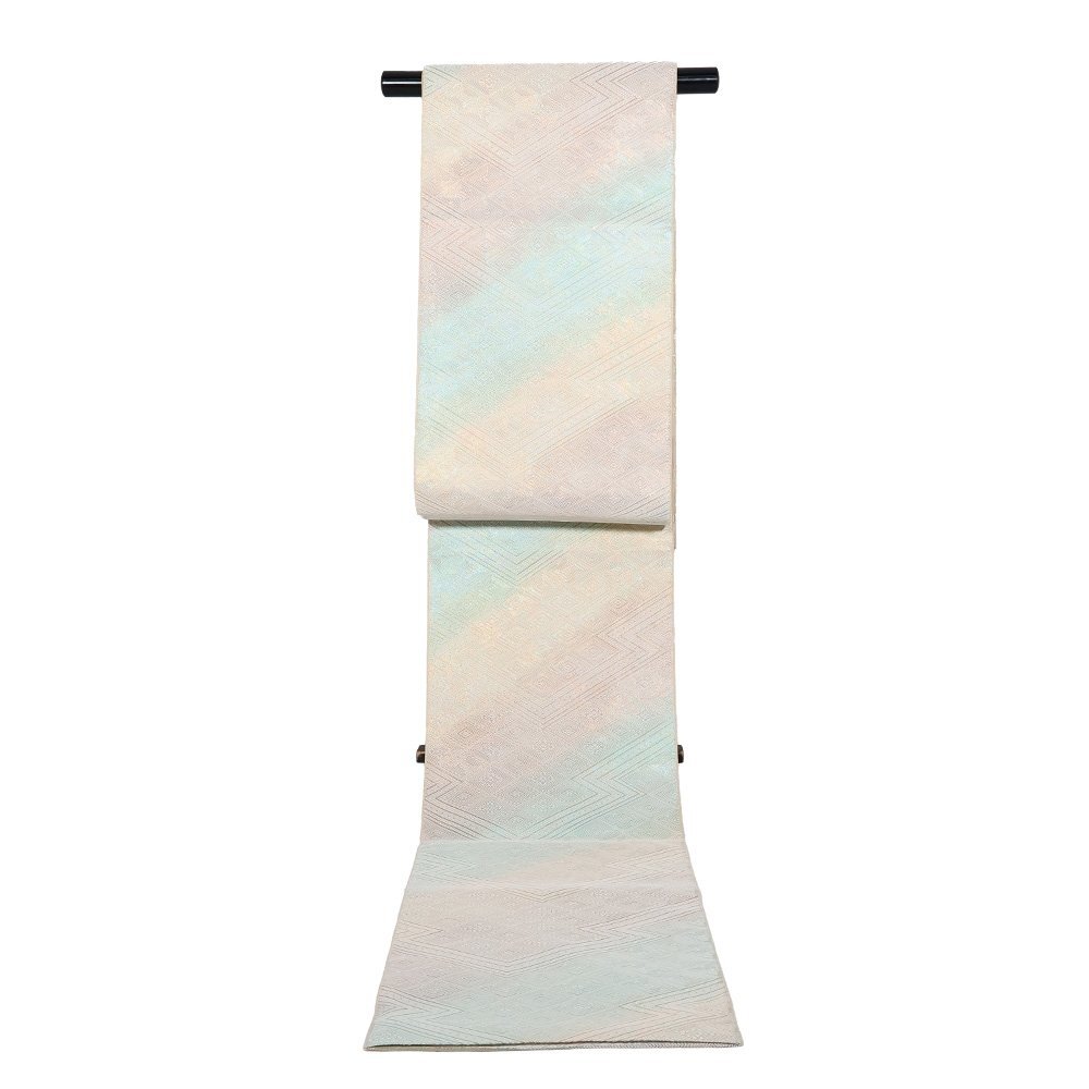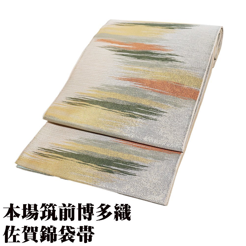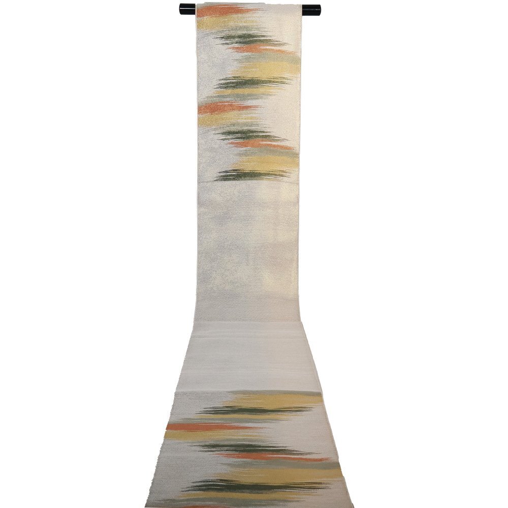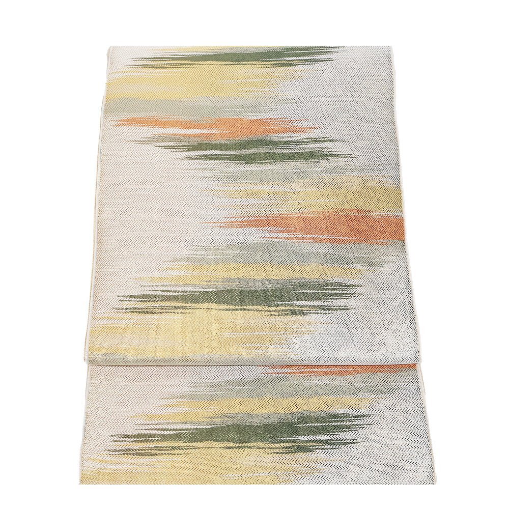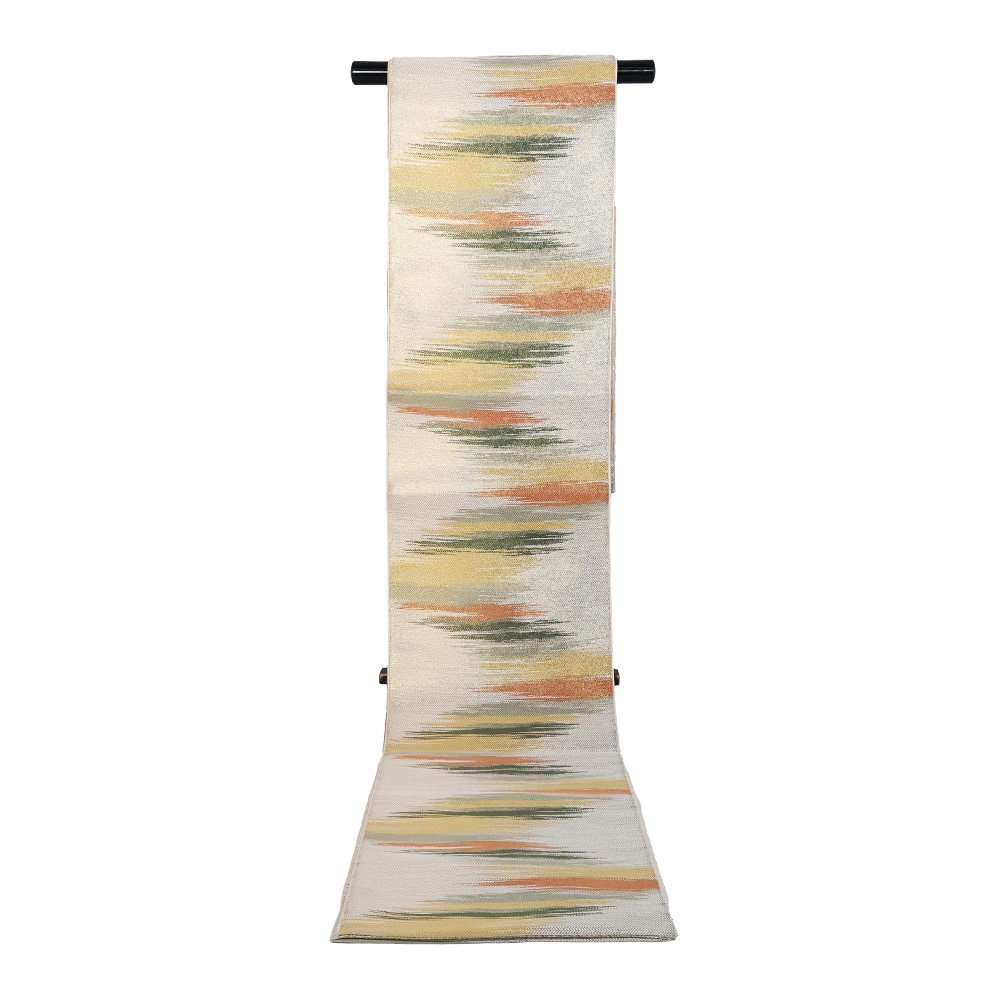 | (株)若林謹製 本場筑前博多織 佐賀錦袋帯 ベージュ・金糸通し地 赤・緑・黄緑・薄緑・黄土色・霞文 仕立て上がり |