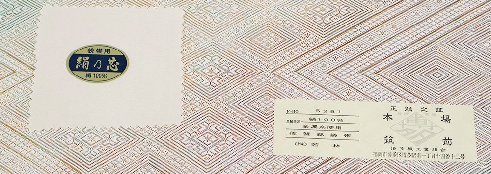 (株)若林謹製 本場筑前博多織 佐賀錦袋帯 ベージュ・金糸通し地 赤・緑・黄緑・薄緑・黄土色・霞文 (写真では上手く色が出ない場合があります。ご了承下さい) ※お使いのディスプレイの種類や設定の差により 実物の色と画像の色が少々異なることもございます。 |
