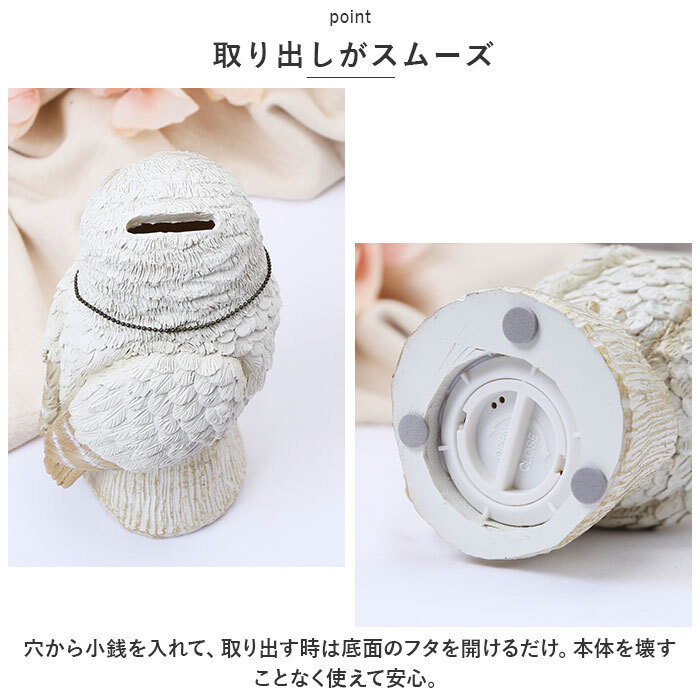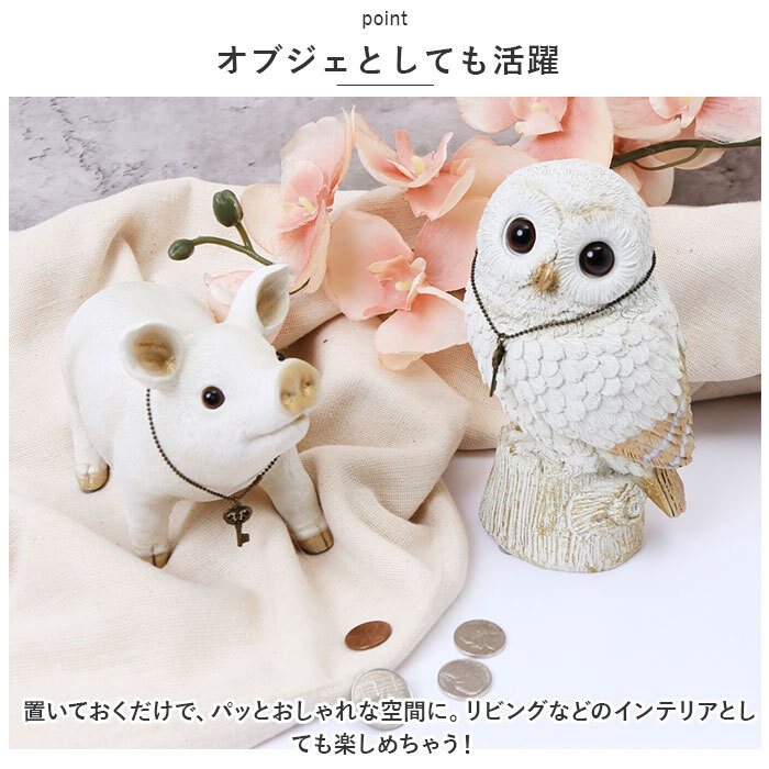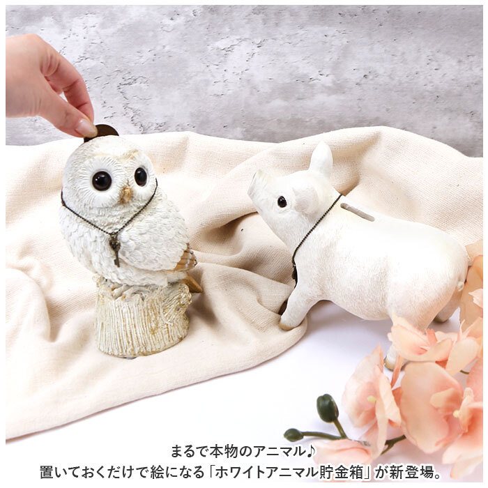 商品説明 | ・・まるで本物のアニマル♪置いておくだけで絵になる「ホワイトアニマル貯金箱」が新登場。 ・【リアルな造形のアニマルデザイン】 ・愛らしい表情や再現度の高いフォルム。幸せを呼び込んでくれそうな、ホワイトカラーのアニマルたち♪ ・【取り出しがスムーズ】 ・穴から小銭を入れて、取り出す時は底面のフタを開けるだけ。本体を壊すことなく使えて安心。 ・【オブジェとしても活躍】 ・置いておくだけで、パッとおしゃれな空間に。リビングなどのインテリアとしても楽しめちゃう! ・【選べるデザイン】 ・お気に入りの子を見つけて、楽しく貯金☆ボックス入りでギフトにもおすすめ。 |