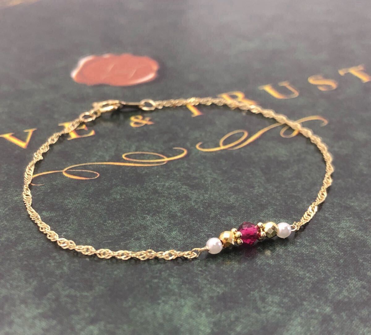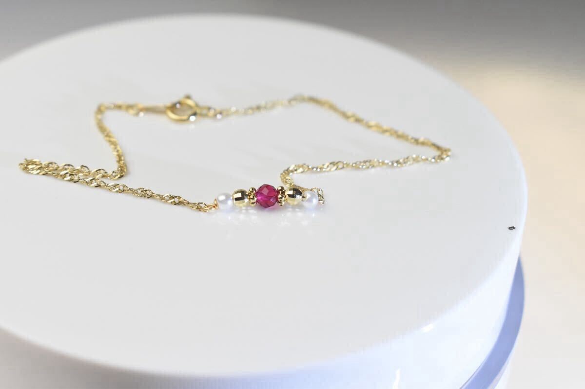 k18 18金 15.5cm ブレスレット ルビーブレスレット3mm アンクレット スクリューチェーン0.9mm 淡水パール2mm ミラーボール2.5mm