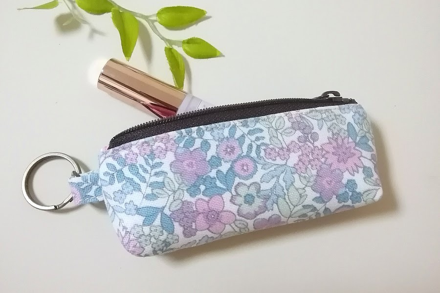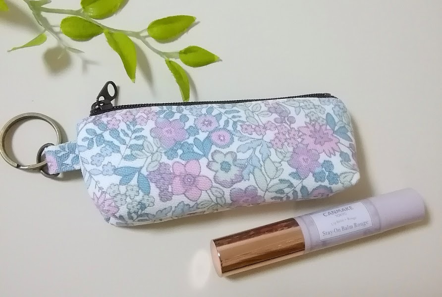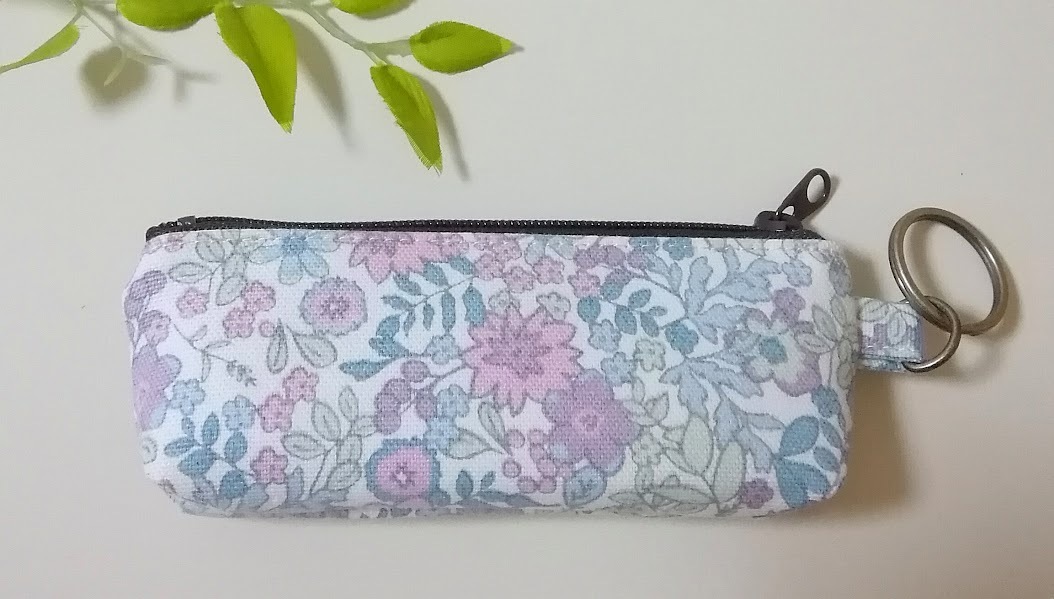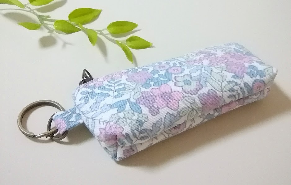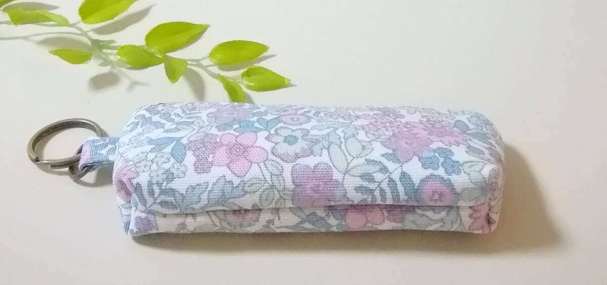 ハンドメイド〈キーリング付き〉 横長ミニポーチ  やさしい色合いの小花柄*tiny flower (12×4.5×2)※リップケ-ス/コインケースに