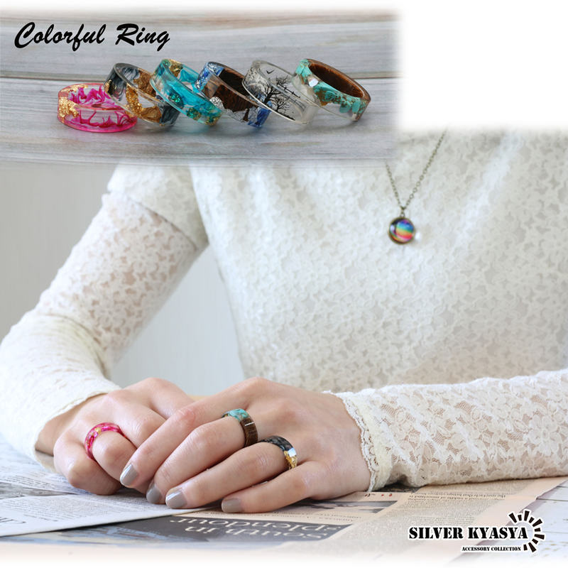 様々な色を樹脂で閉じ込めたカラフルで可愛いデザインのリング
