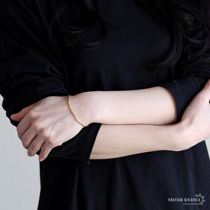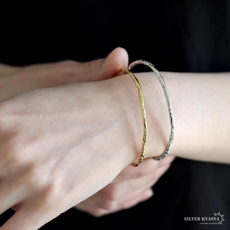 ギャザーを入れたようなニュアンス感たっぷりのデザインがお洒落なバングル。シンプルなデザインが女性らしさを引き立てます。上品でありながら、カジュアルなテイストにも合う万能アイテム。