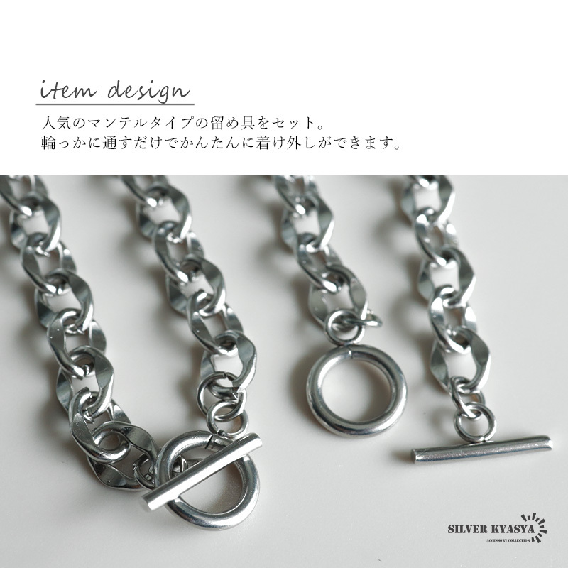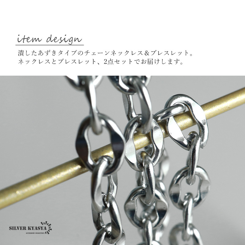 潰したコマがユニークに輝くあずきチェーンのアイテム。留め具は人気のマンテルタイプです。ブレスレットとネックレスのセットで統一感あるスタイルを楽しめます。