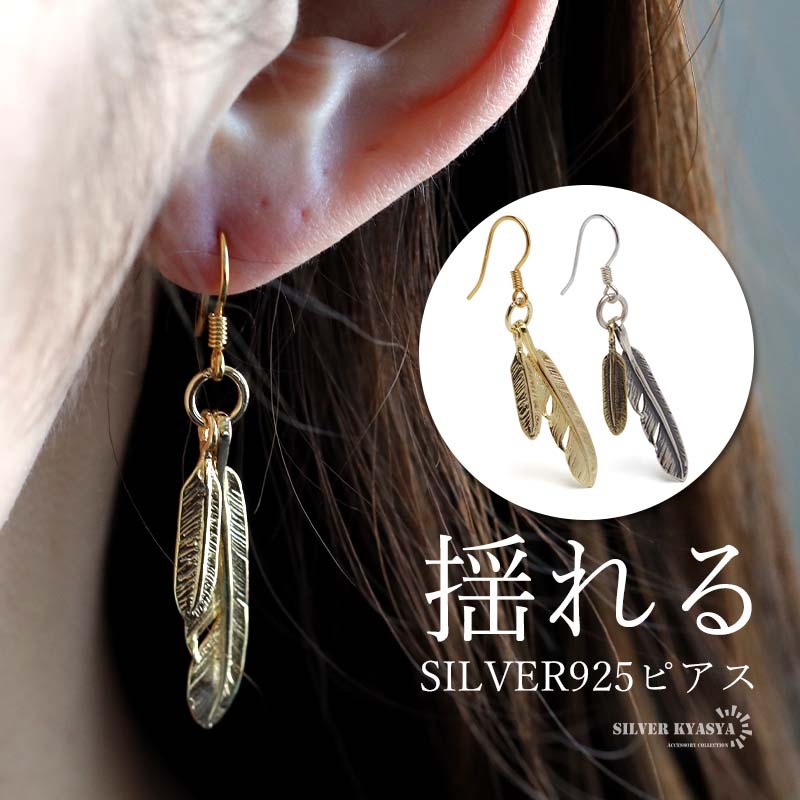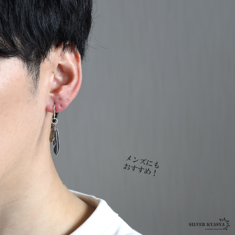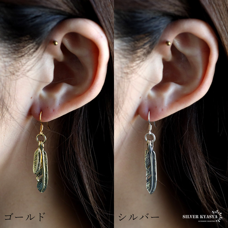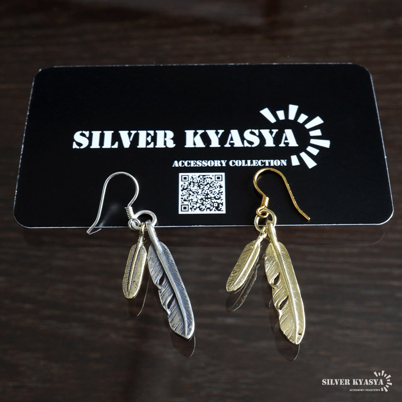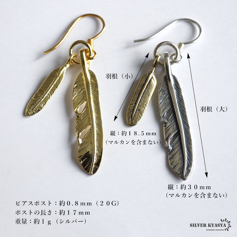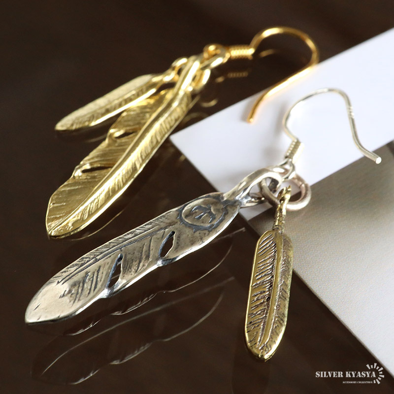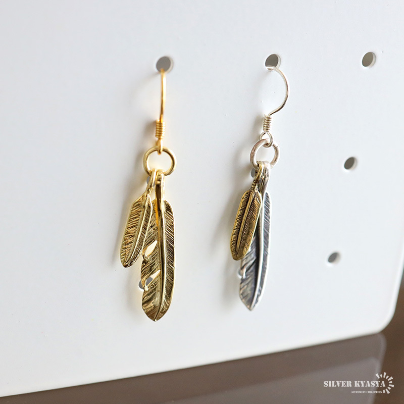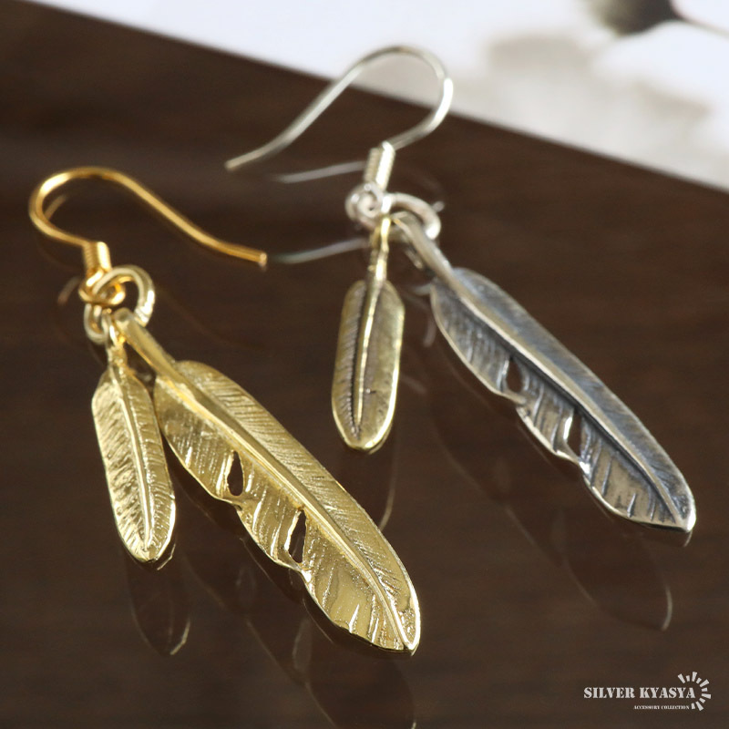 フェザーモチーフを大小2つセットしたフックピアス。羽根の細かな部分まで繊細に表現した逸品。揺れ動く羽根が存在感を演出してくれます。シンプルな装いにもピッタリ◎