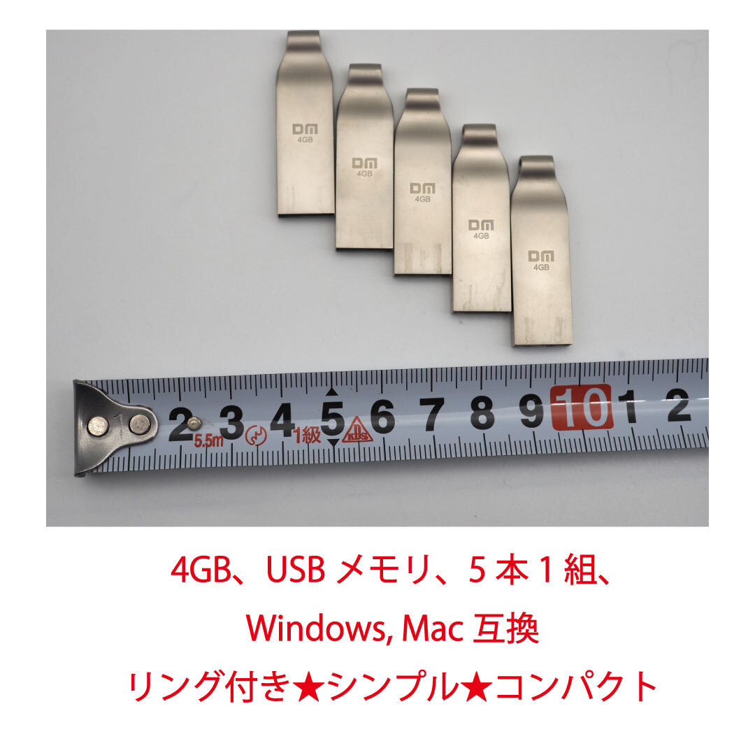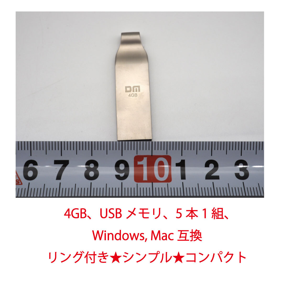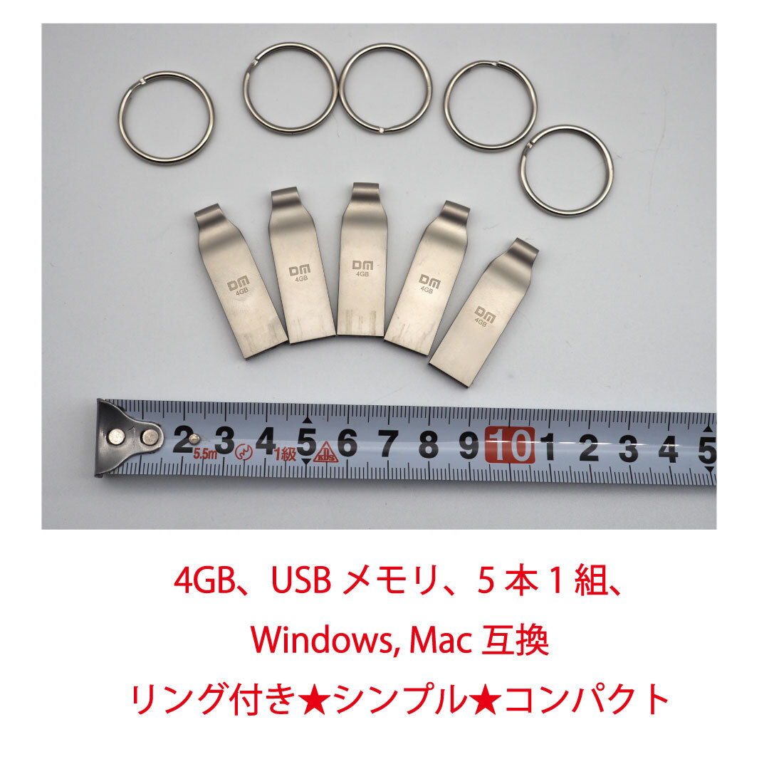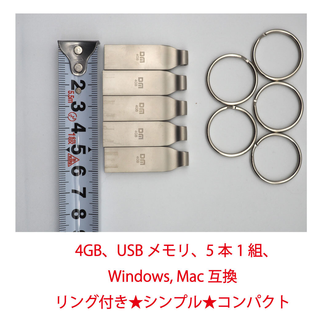 シンプルでコンパクトなUSBメモリ4GBの5本セットです。WindowsとMacで互換性のあるFAT32でフォーマットしています。リングは外してお送りしますが、リングを付けるとメモリが区別できて、携行性がアップします。