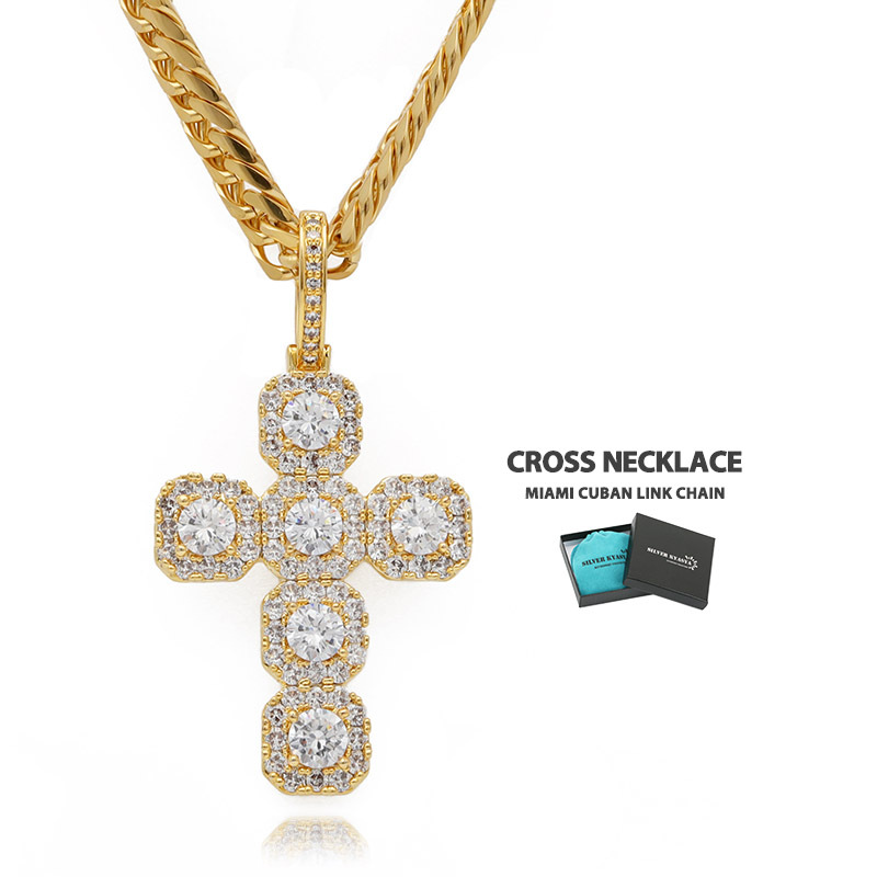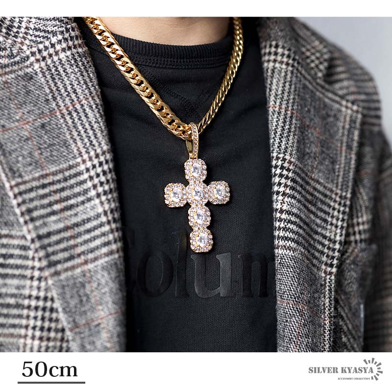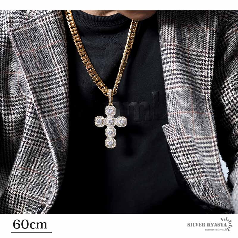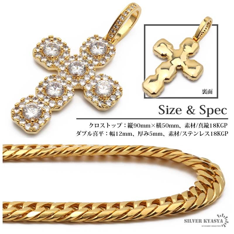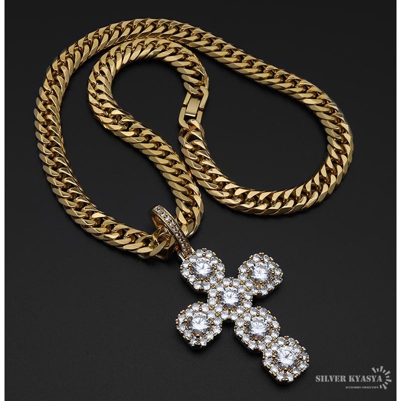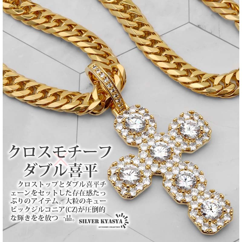 クロスのトップとダブル喜平チェーンをセットした存在感たっぷりのアイテム。大粒のキュービックジルコニア(CZ)が圧倒的な輝きを放つ一品。