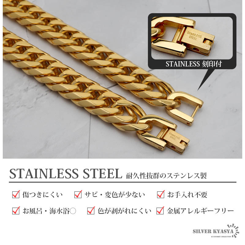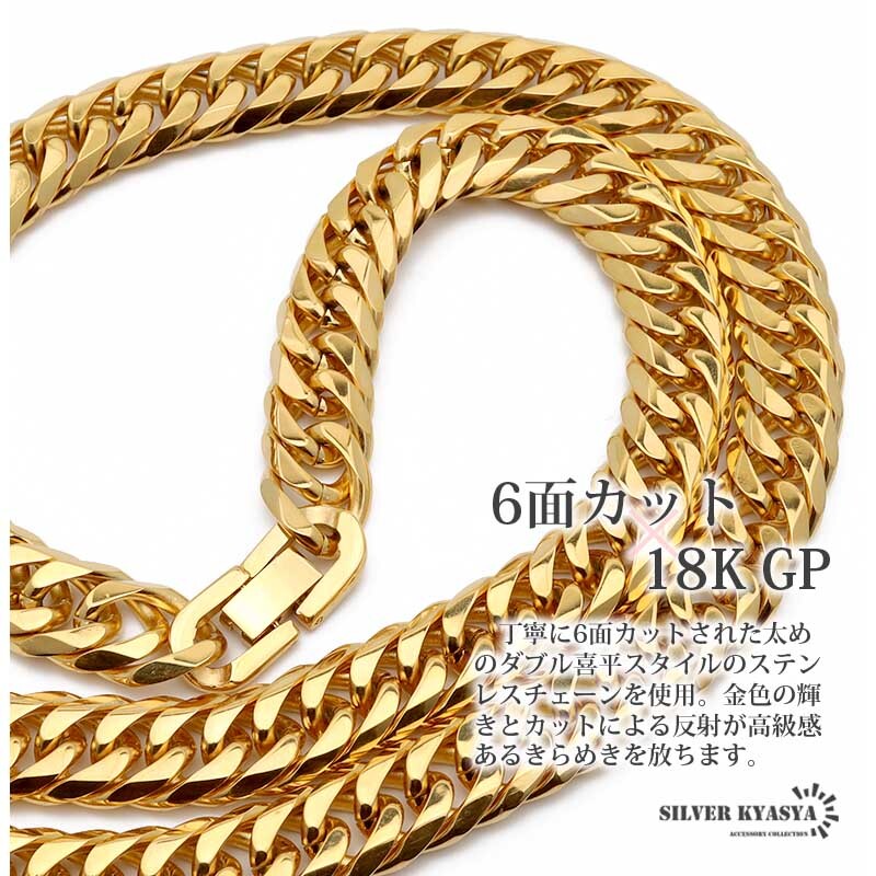 丁寧に6面カットされた太めのダブル喜平スタイルのステンレスチェーンを使用。金色の輝きとカットによる反射が高級感あるきらめきを放ちます。