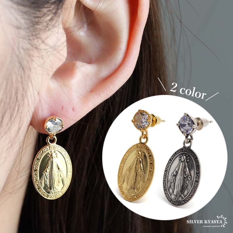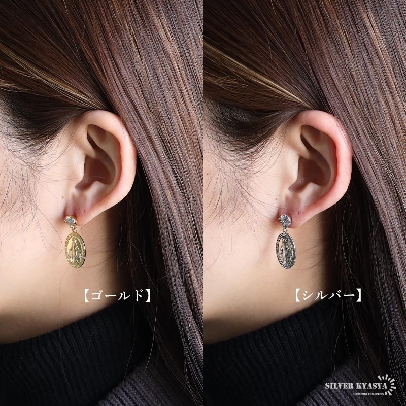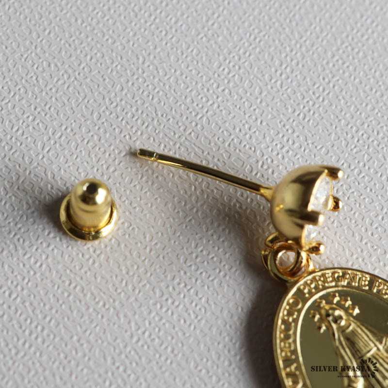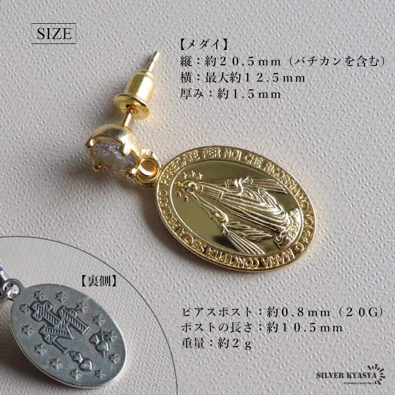 サイズ | メダイ:縦約20.5mm(バチカンを含む)、横最大約12.5mm、厚み約1.5mm ピアスポスト:約0.8mm(20G) ポストの長さ:約10.5mm 重量:約2g |