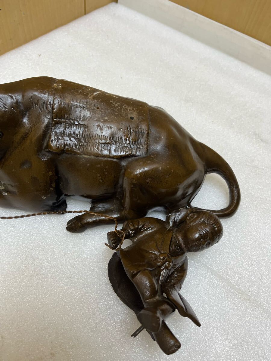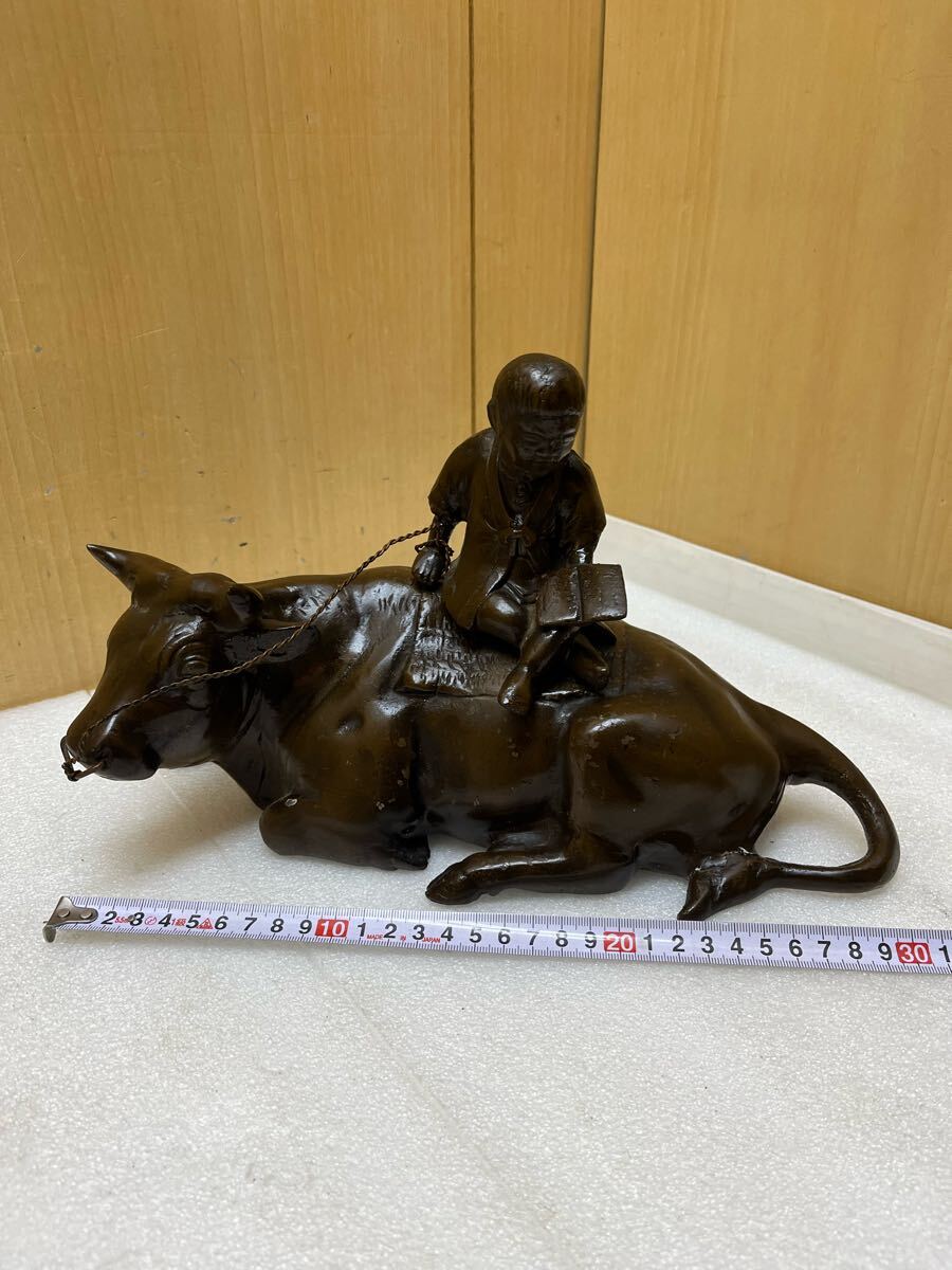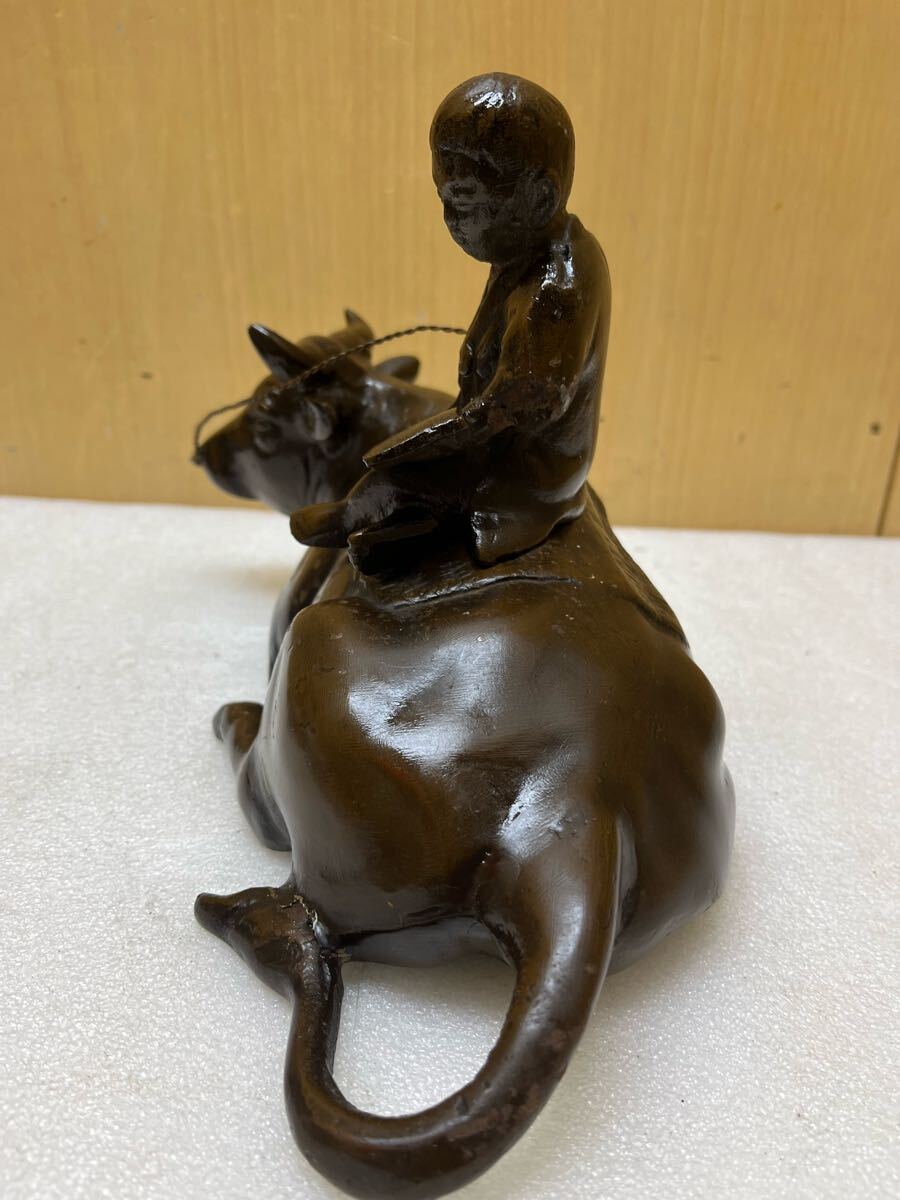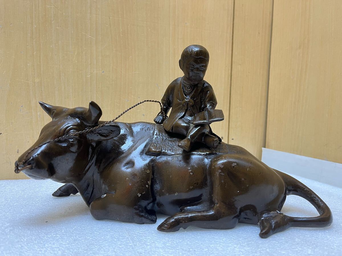 RE2166 鉄製 牧童 牛置物 重量3656g 牛と童子 時代物 オブジェ 骨董 インテリア 和風 干支 鉄器 縁起物 鉄彫刻 現状品 0207