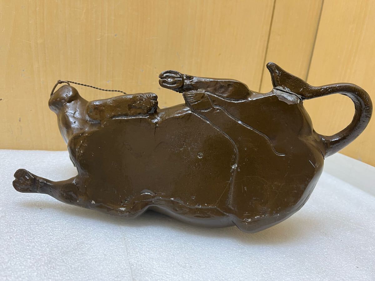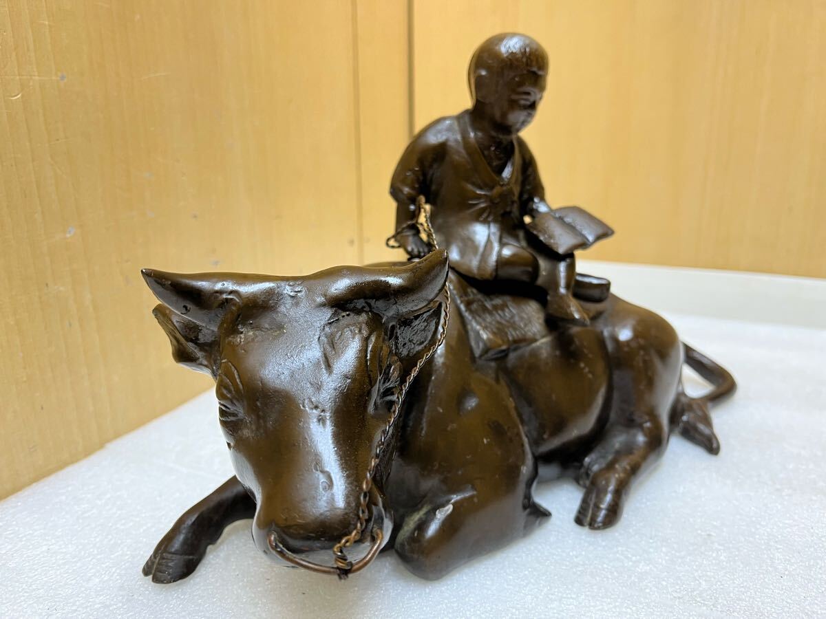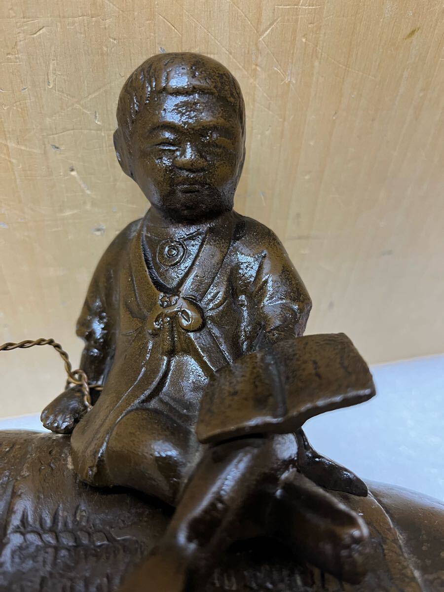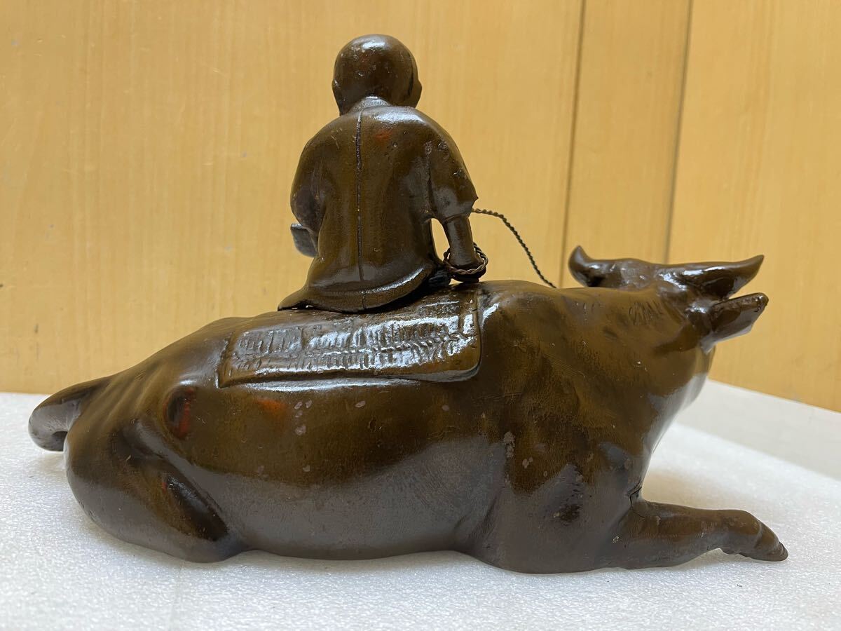 RE2166 鉄製 牧童 牛置物 重量3656g 牛と童子 時代物 オブジェ 骨董 インテリア 和風 干支 鉄器 縁起物 鉄彫刻 現状品 0207