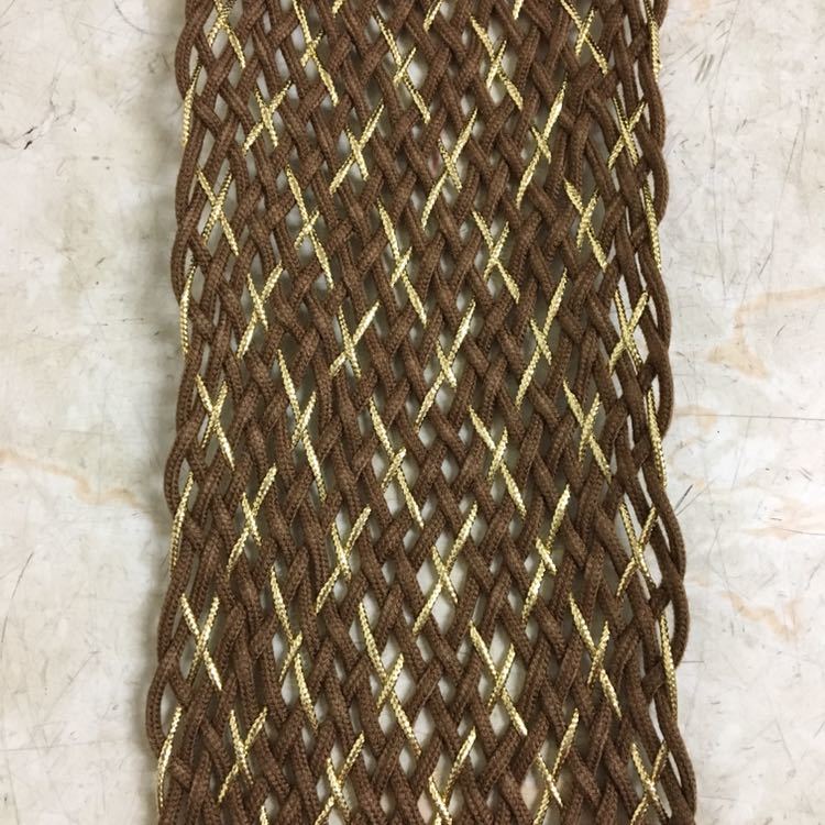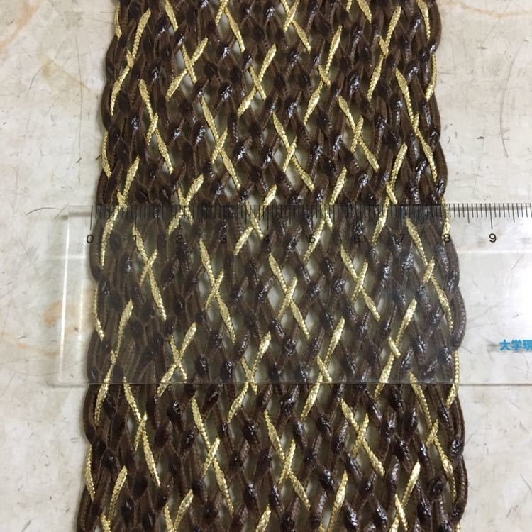 染色したアクリル紐とラメ紐を使用して製紐機で組み上げ、特殊な液を使い艶出しを施した大変凝った商品となっております。