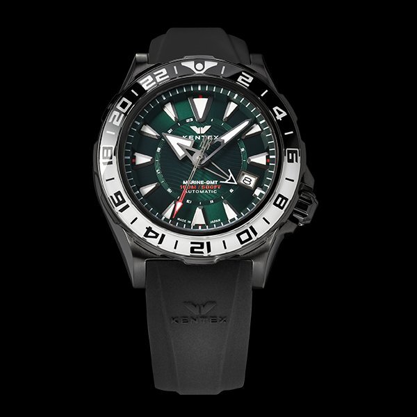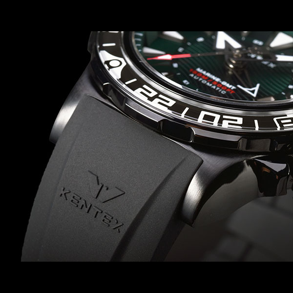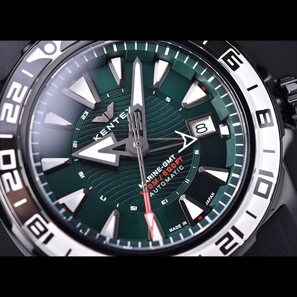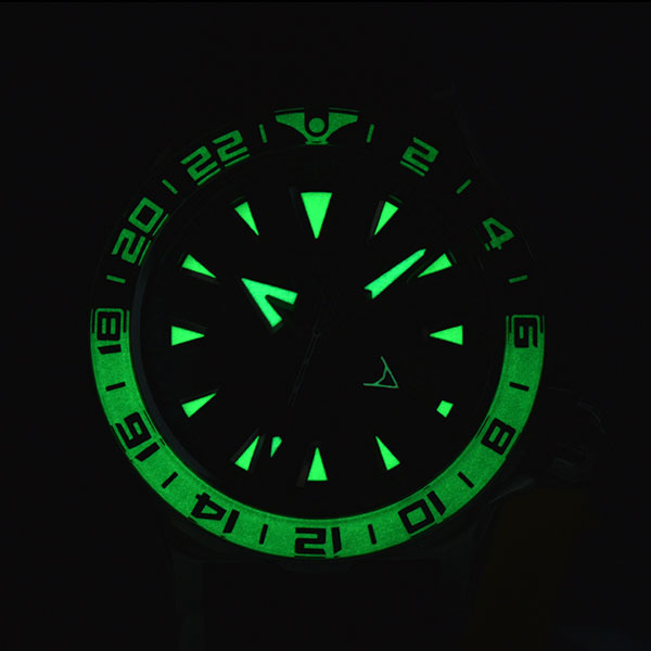 ベゼル:サファイヤパネル、両回転式1周24ピッチGMTベゼル、蓄光目盛り