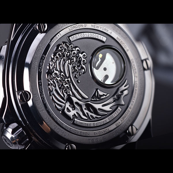 裏蓋:6点ネジ止め、型打ち波富士模様、パーシャルスケルトン
