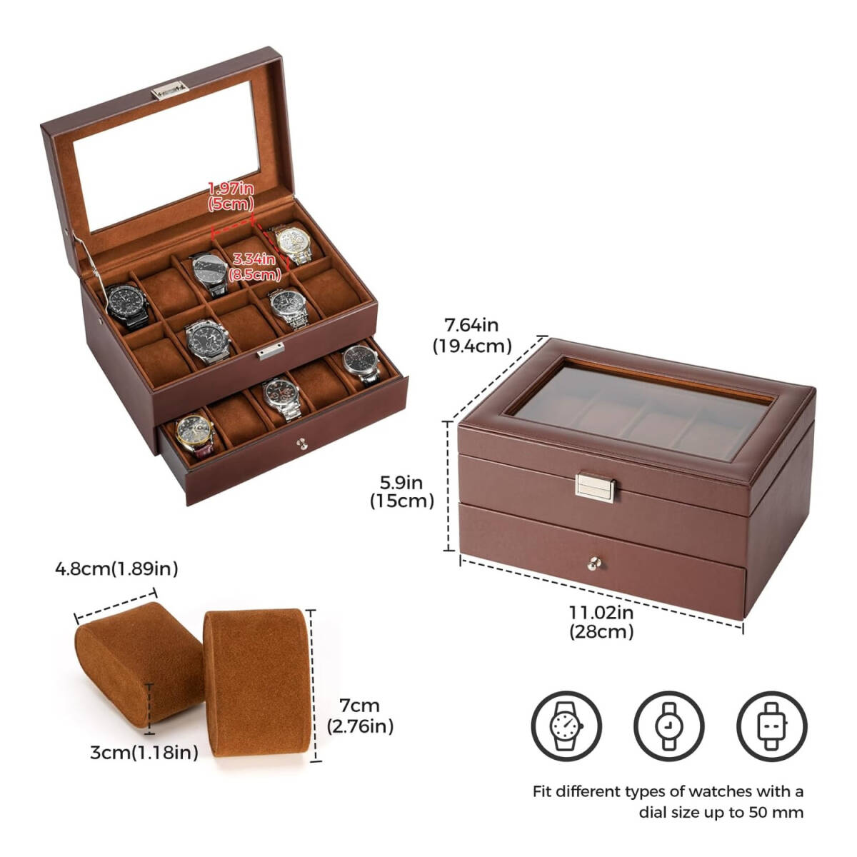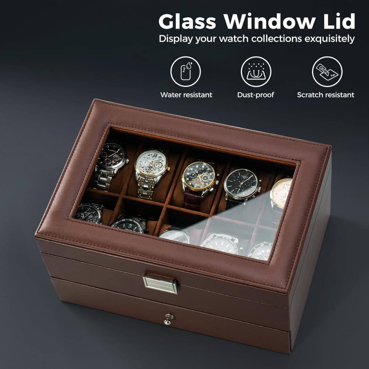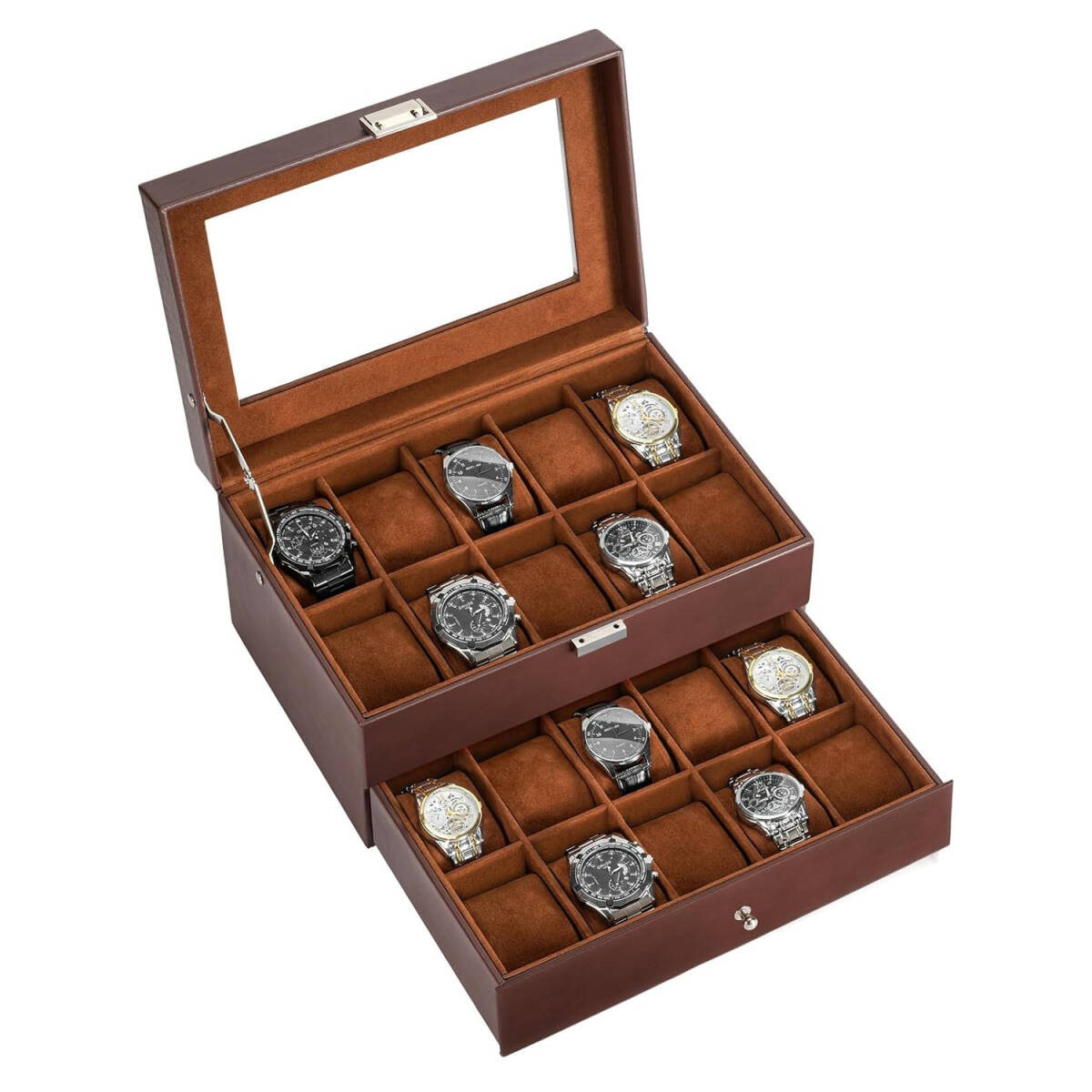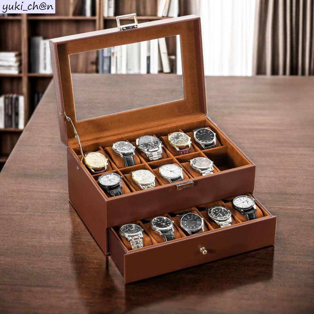 腕時計ケース 20本用 2段式 エスプレッソ PUレザー ウオッチボックス アクセサリー収納 ガラス天板 ディスプレイケース 小物