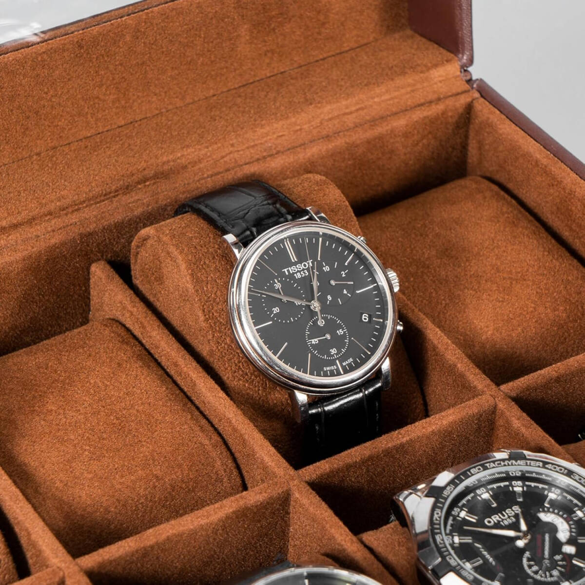PUレザー製の外装と柔らかな裏地により、スタイリッシュな外観を実現し、時計を保護します。