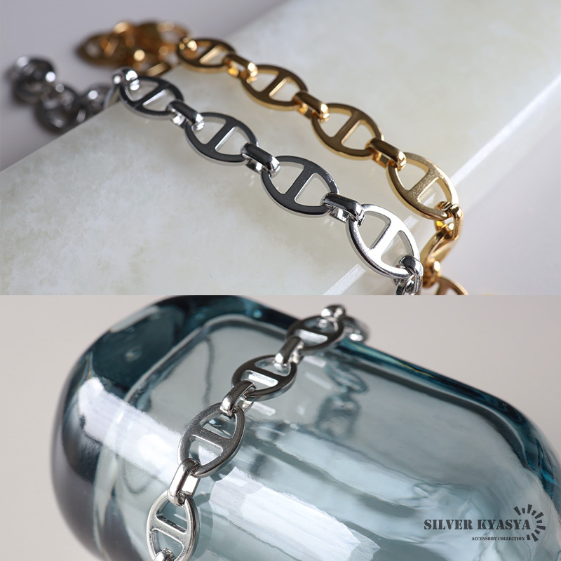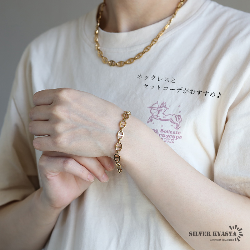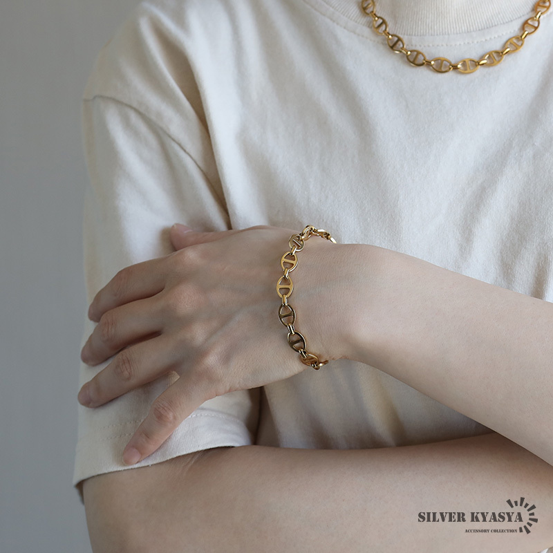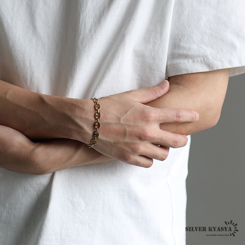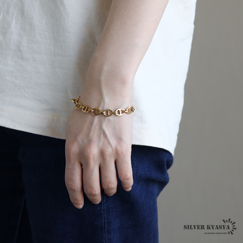 洗練された雰囲気を感じさせるアンカーチェーンブレスレット。透かしのあるコマが軽やかな印象を与え、肌に馴染むデザインです。