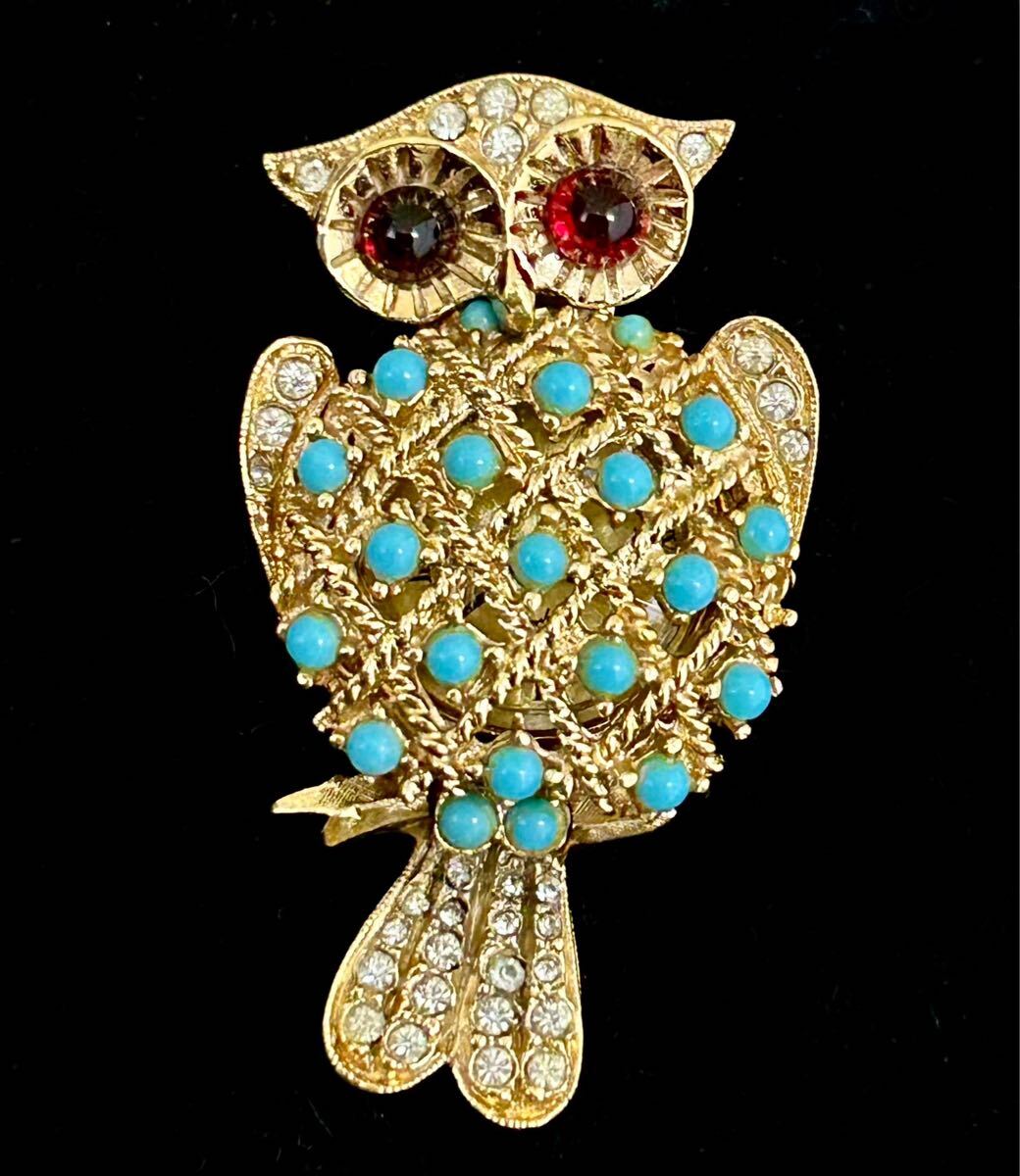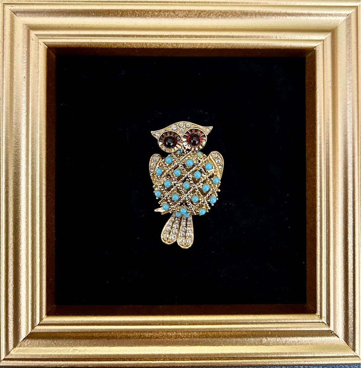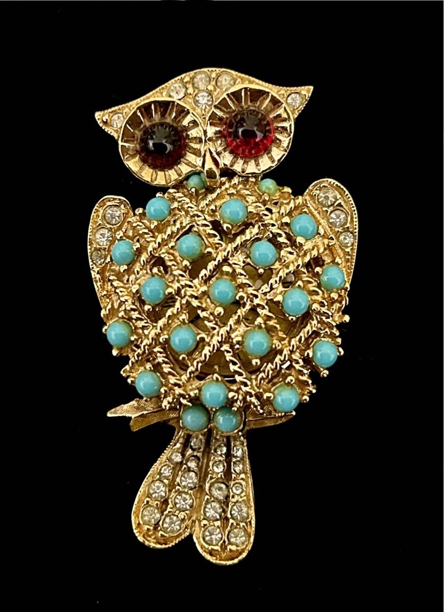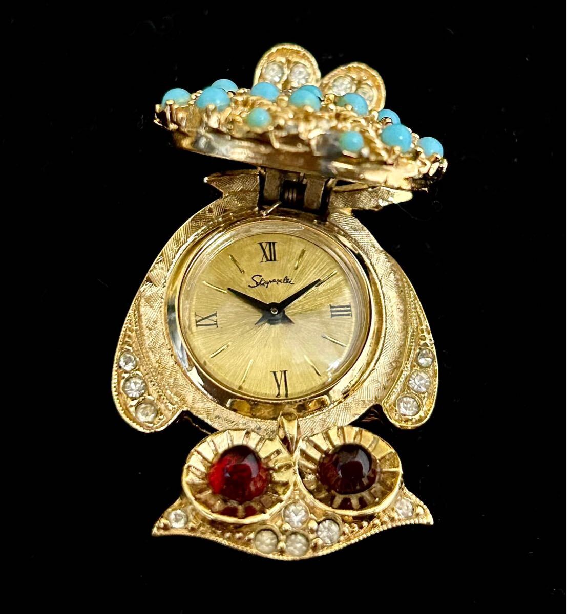 エルザ・スキャパレリの、フクロウをモチーフしたブローチです。中は時計になっており、フクロウの頭上を抑えるように裏側へ押すとフタが開きます。