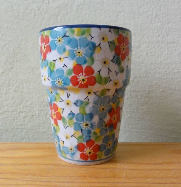 ポーランド ボレスワヴィエツ陶器 赤&水色&白花 UNIKAT T.LIANA柄カップ/グラスです。