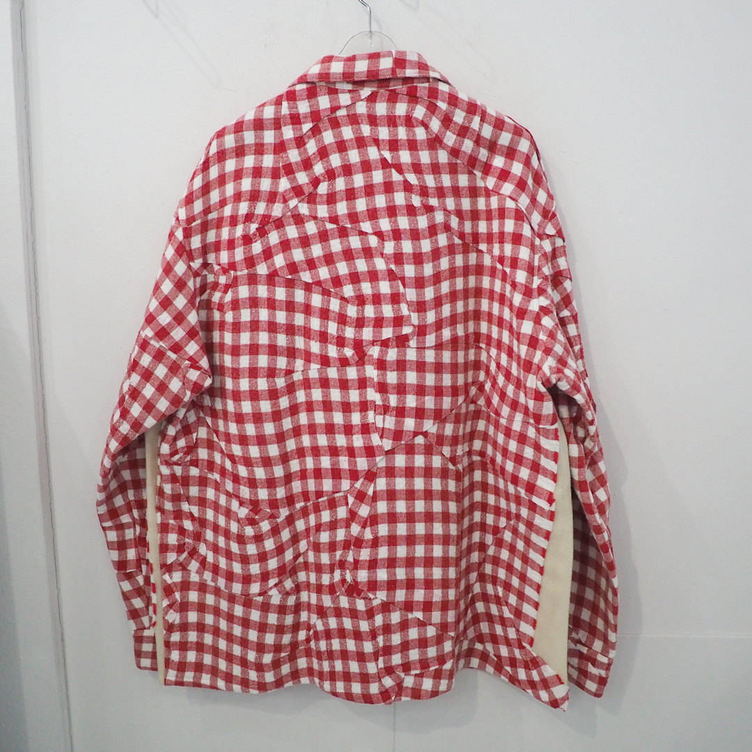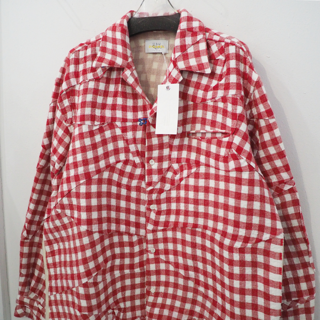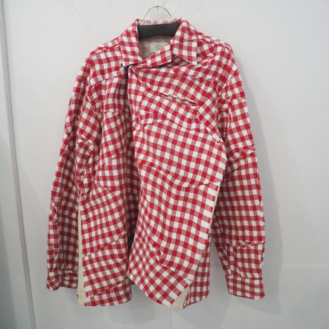 URU TOKYOとコラボした2023ssのアイテムで、生地を重ね圧縮することでフェルト状にした"ニードルパンチ加工"素材を使用し、シャツジャケット型、オーバーサイズ、ランダムに張り合わされたギンガムチェック柄地、デザインが変えれるフック付き、胸ポケットなど、細部まで凝ったデザインです 。