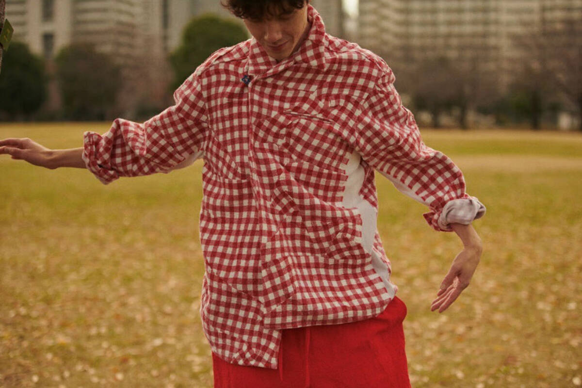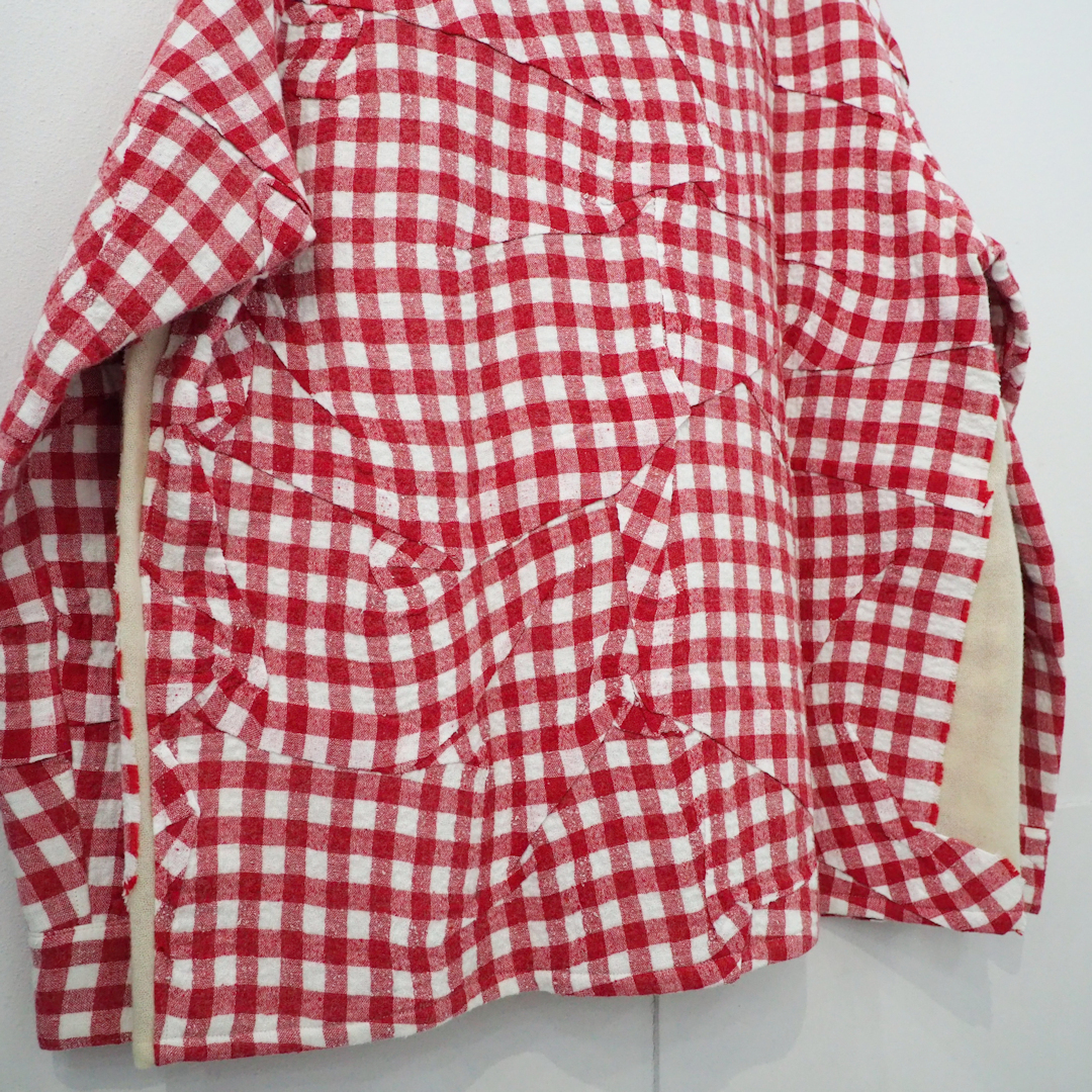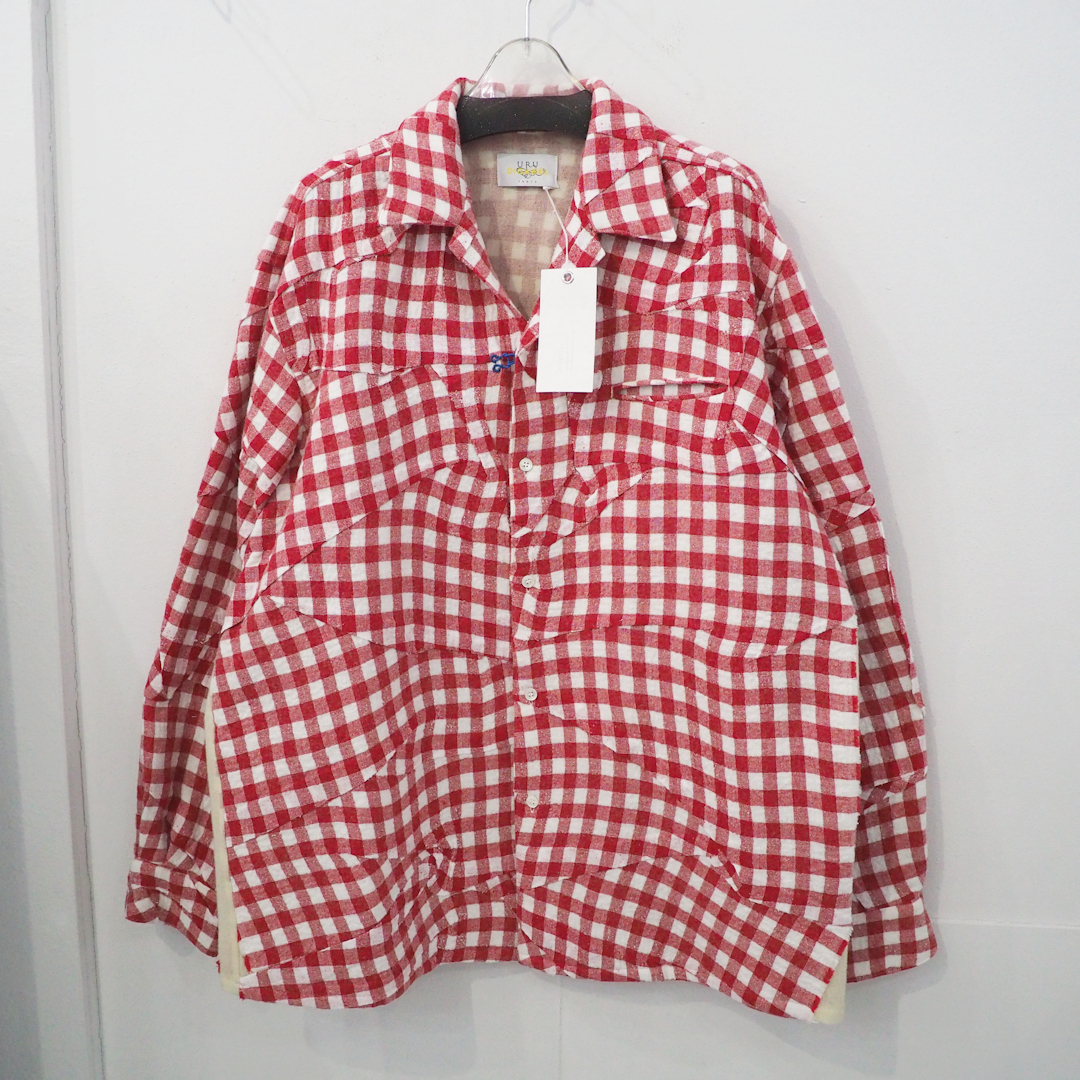 URU TOKYOとコラボした2023ssのアイテムで、生地を重ね圧縮することでフェルト状にした"ニードルパンチ加工"素材を使用し、シャツジャケット型、オーバーサイズ、ランダムに張り合わされたギンガムチェック柄地、デザインが変えれるフック付き、胸ポケットなど、細部まで凝ったデザインです 。