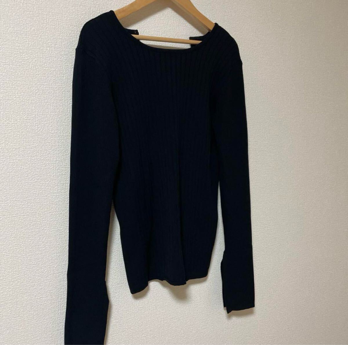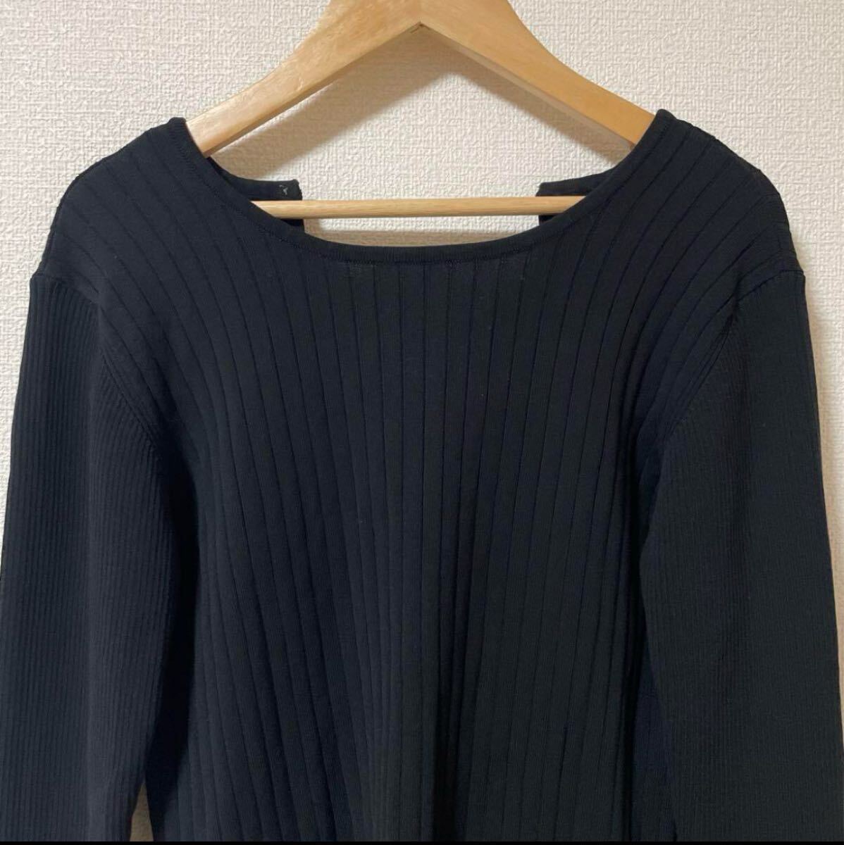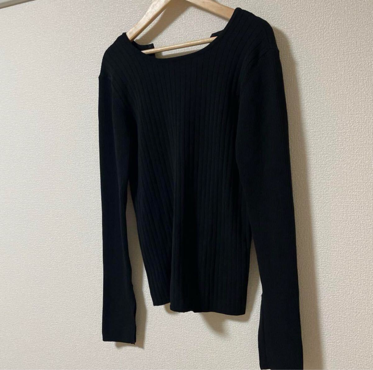 リブ編みのブラック長袖ニット、ボートネックデザインでスタイリッシュ。