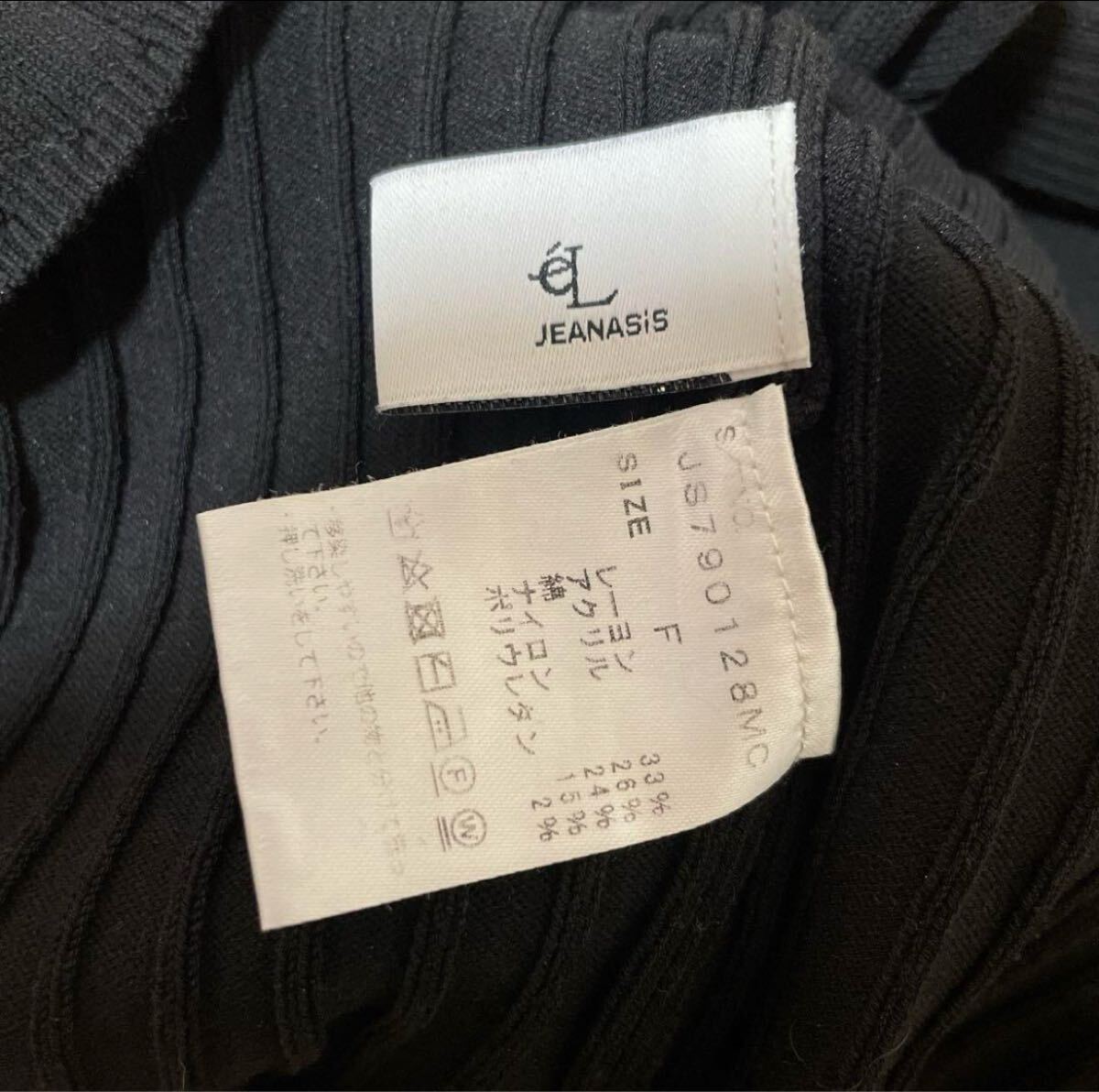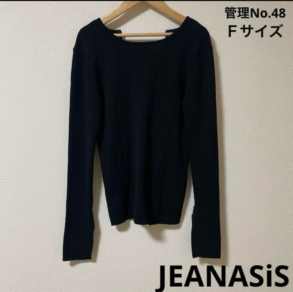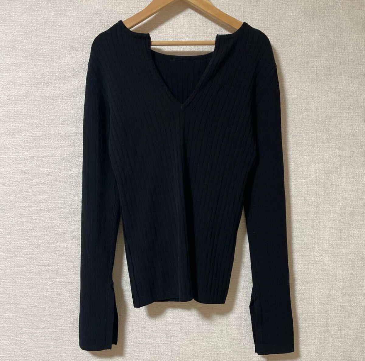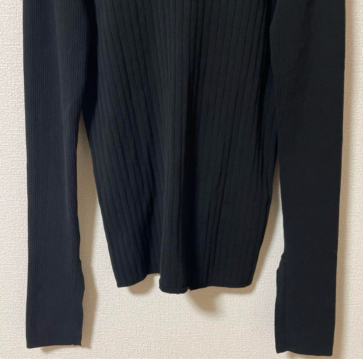 リブ編みのブラック長袖ニット、ボートネックデザインでスタイリッシュ。