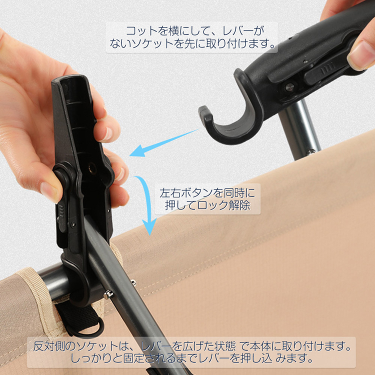 ●2段階高さ調整コット、ハイ/ロー2WAY 折り畳み式で簡単組み立て&収納可能。
