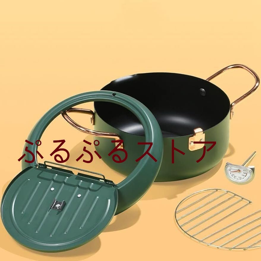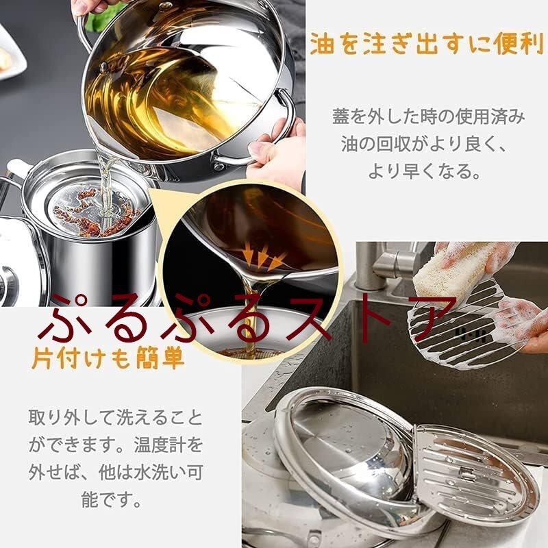 【油切りと温度計】フタにはステンレス製の油切りが付いており、食品から余分な油脂を排出することができ、操作は簡単です。温度計が付属しており、揚げる時間や食品の温度を簡単に管理できます。