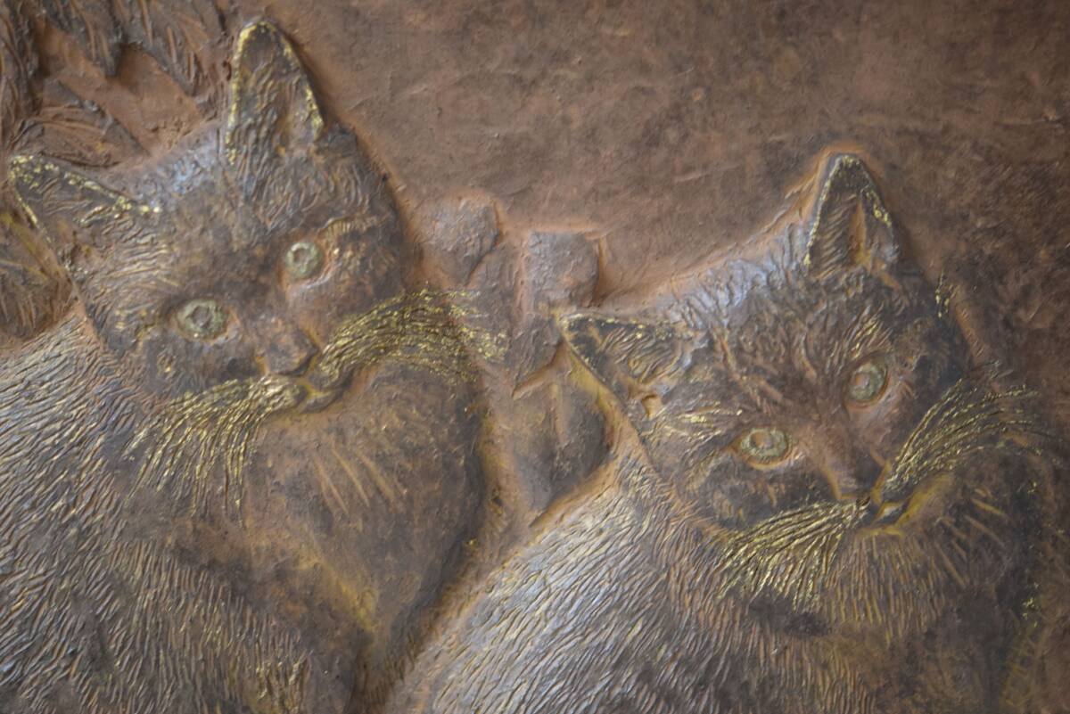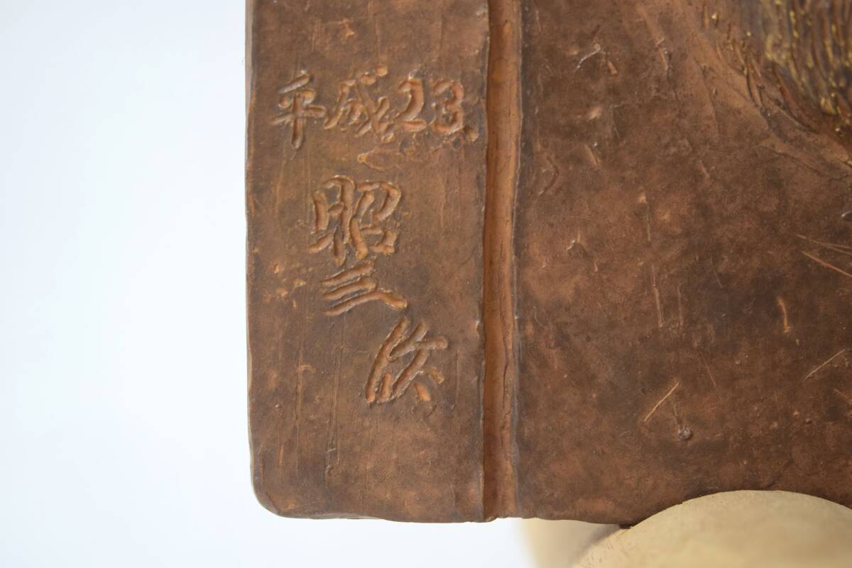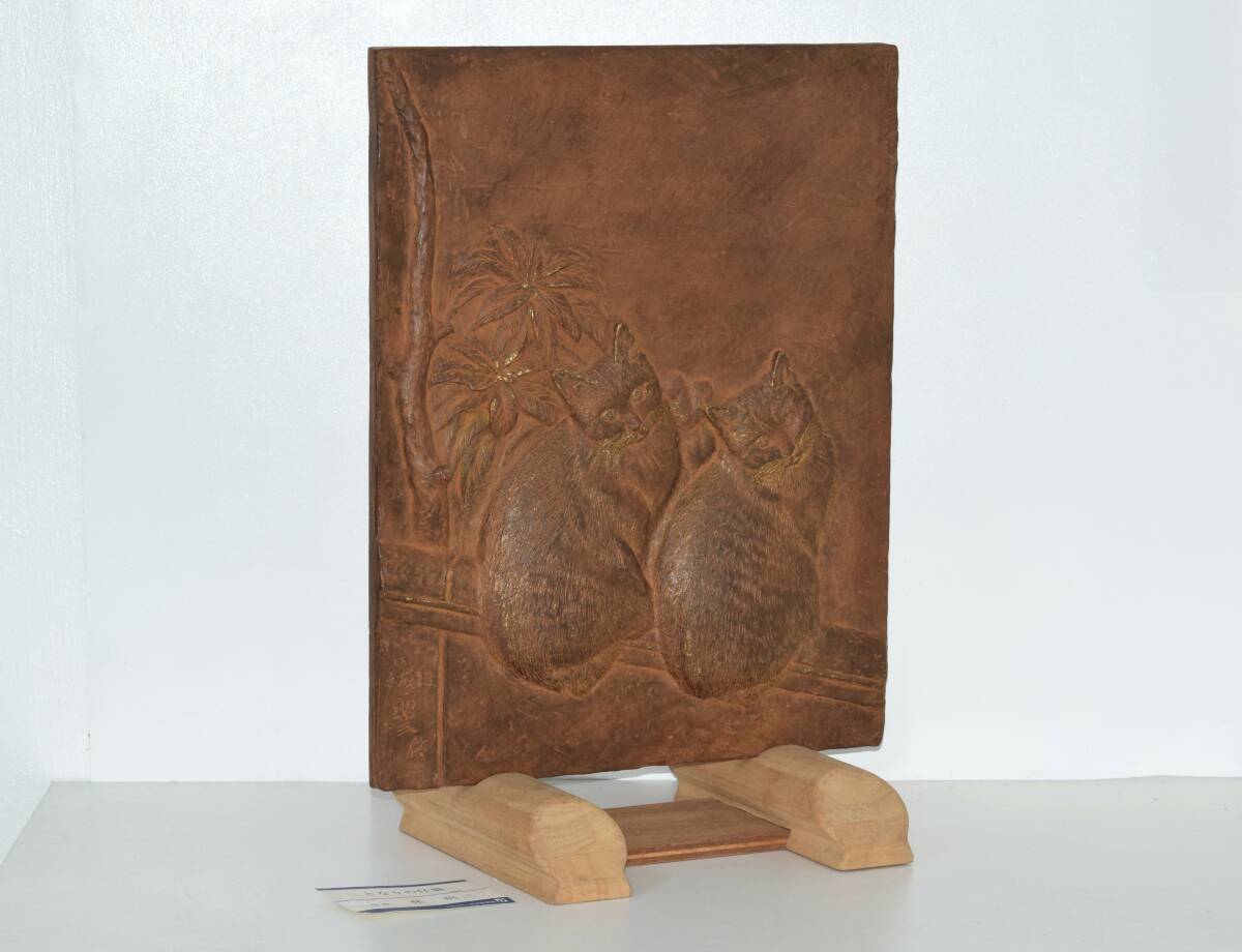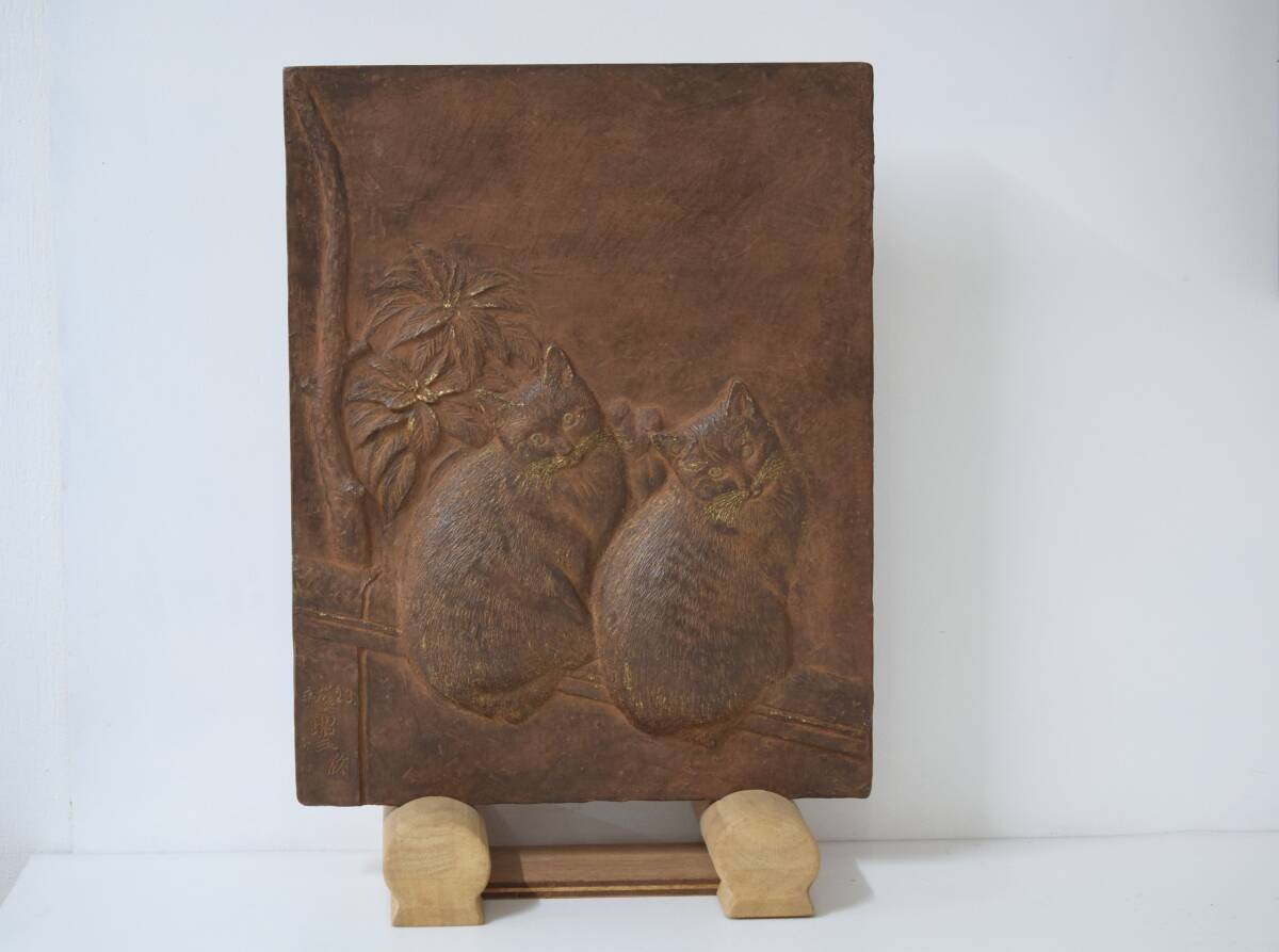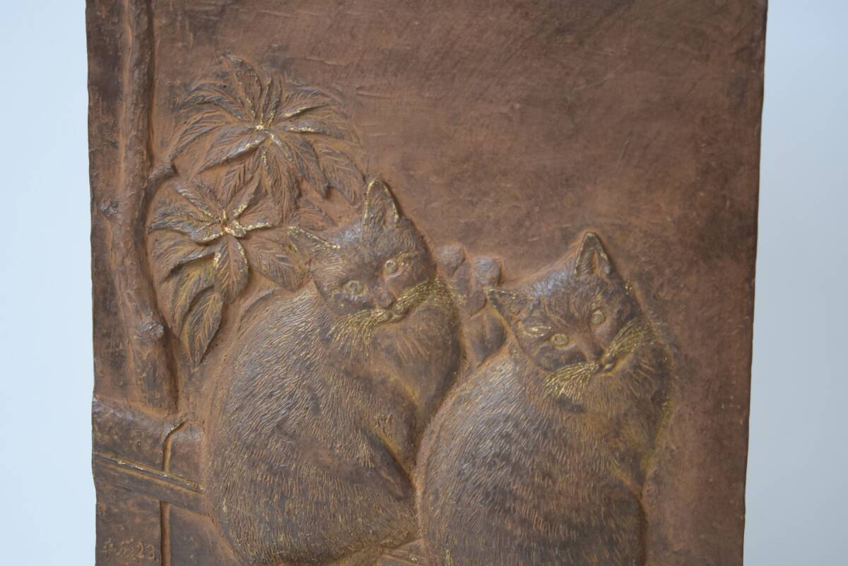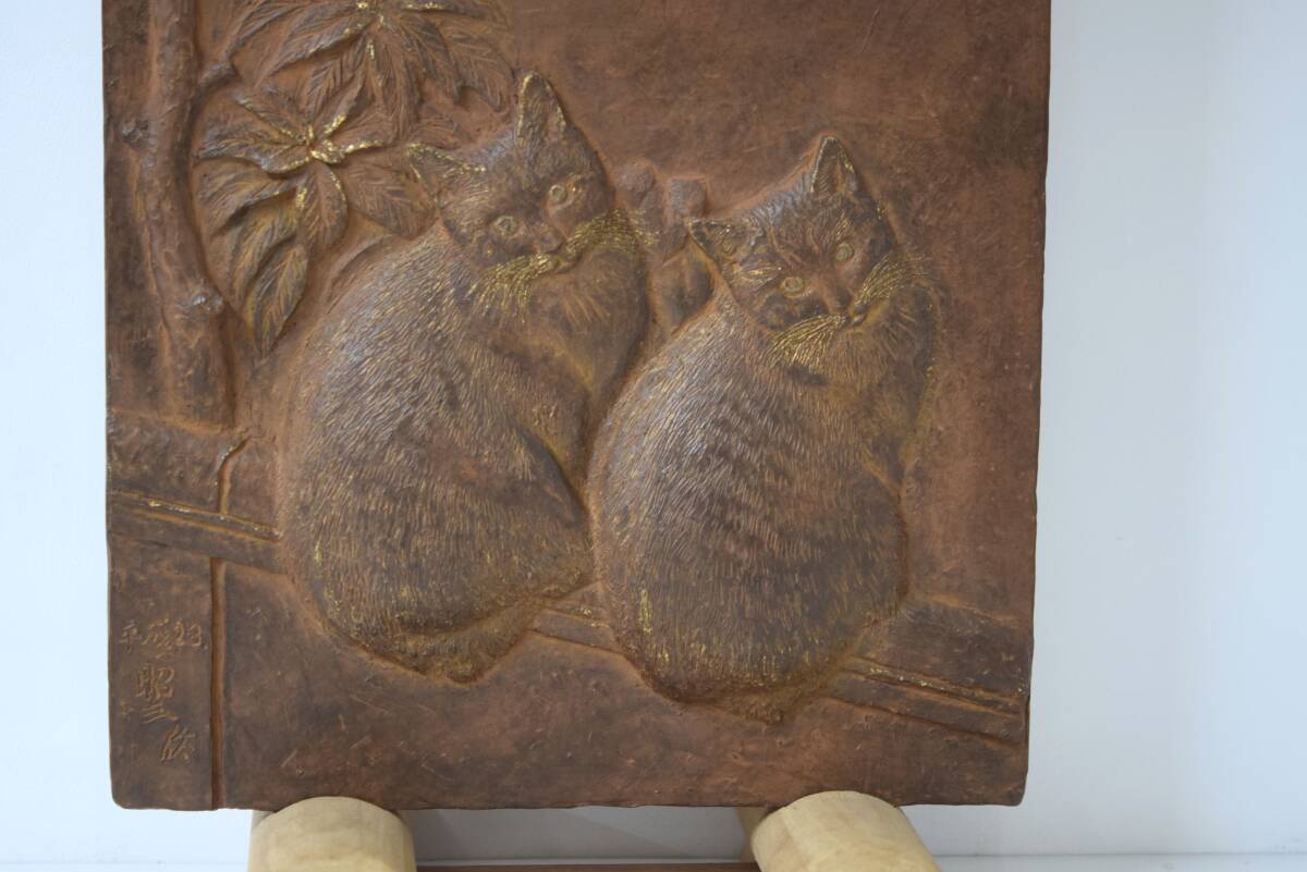 彫刻家 林昭三 日彫展出品作品「となりの仔猫」衝立 パネル 師:羽下修三、高橋剛
