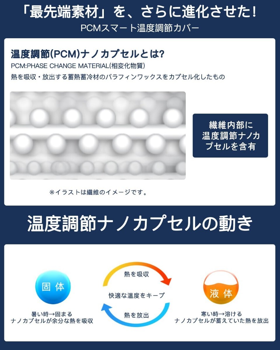 【スマートに温度調節できる枕カバー】付属の枕カバーは最新の宇宙技術を採用し、PCM相変化材料を繊維に導入します。PCM相変化材料が体温に反応して、熱を吸収・放出し、季節に関わらず、一年中睡眠環境を快適に保ちます。