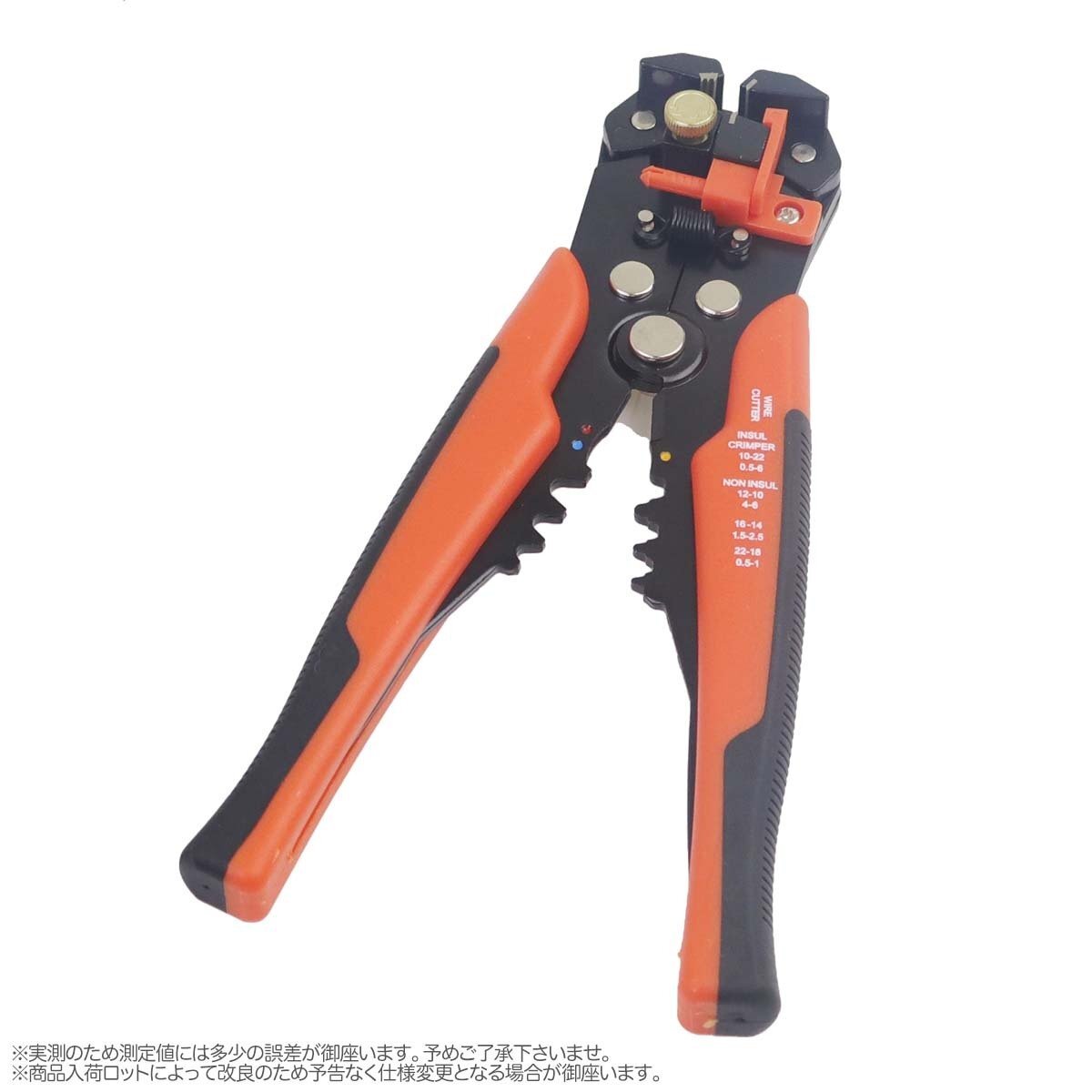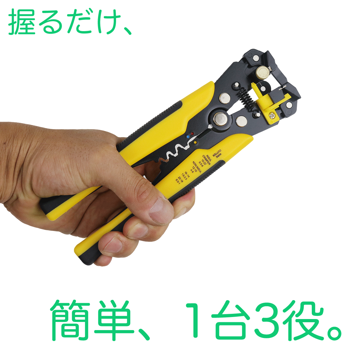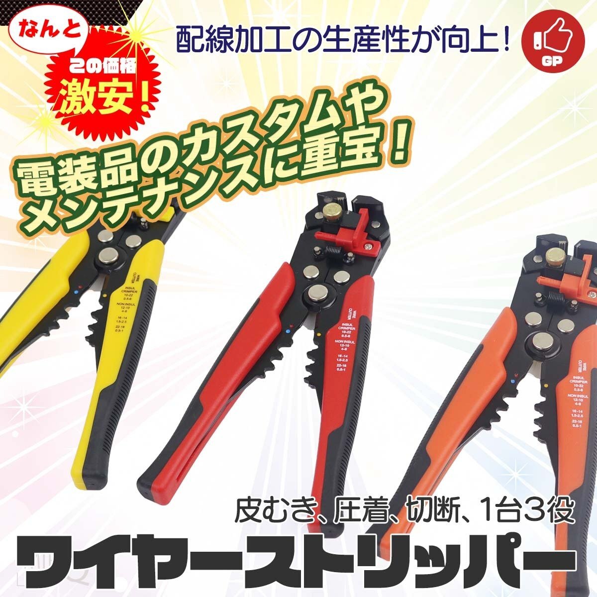 | 商品の詳細 | 1台3役で配線加工にマルチに活躍できるワイヤーストリッパーです。 これ一つで皮剥ぎ(ストリッパー)、切断(カッター)、圧着(クランパー)が可能! 素早く簡単に加工できるので作業効率もぐんとアップします。 【商品仕様】 ・サイズ:約205×110×30mm ・適応電線サイズ:24-10AGW (0.2-6mm) ・適応圧着端子サイズ:22-10AGW (0.5-6mm) ・重量:約325g ・カラー:レッド、オレンジ、黄色(いずれか1つ) ※こちらの商品は完全ランダム発送させていただきます。予めにご了承くださいませ。 | |