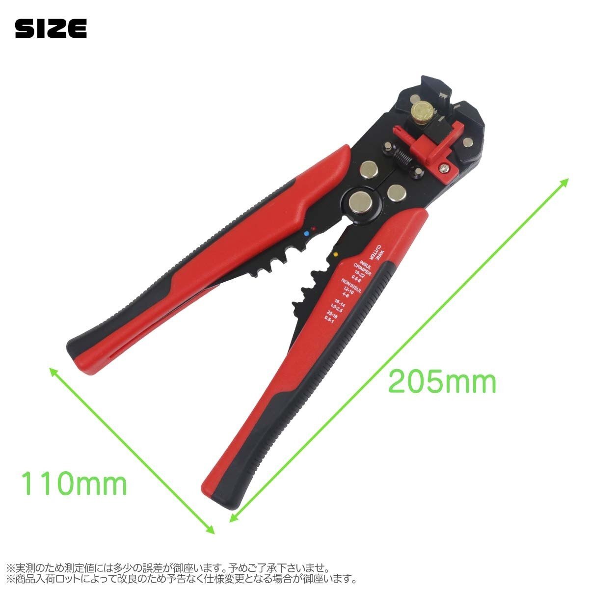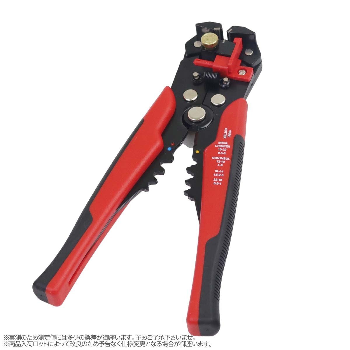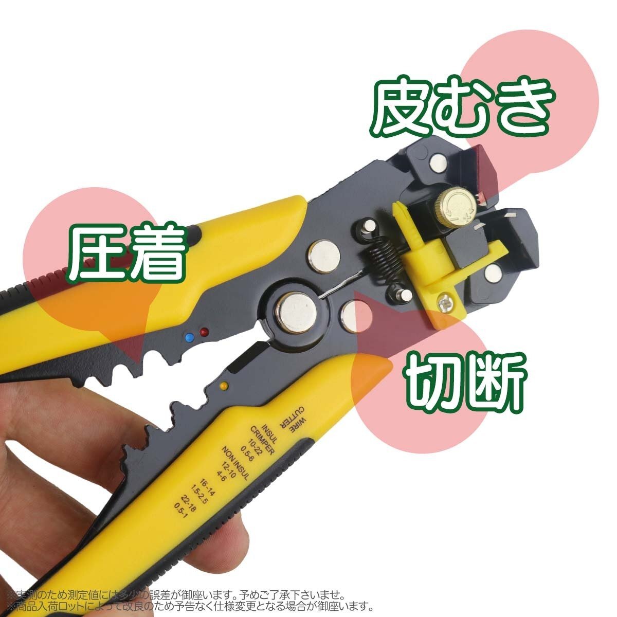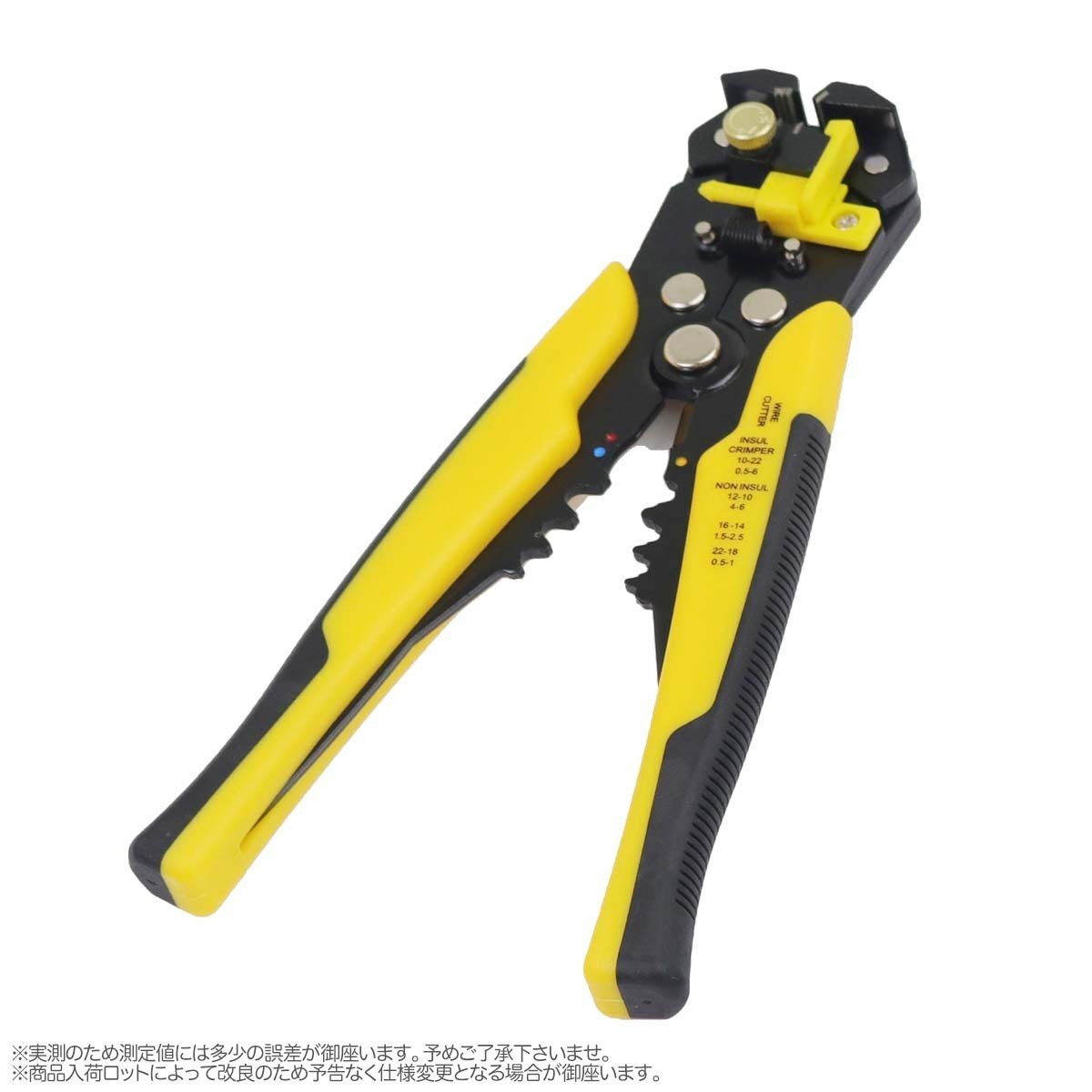 | 商品の詳細 | 1台3役で配線加工にマルチに活躍できるワイヤーストリッパーです。 これ一つで皮剥ぎ(ストリッパー)、切断(カッター)、圧着(クランパー)が可能! 素早く簡単に加工できるので作業効率もぐんとアップします。 【商品仕様】 ・サイズ:約205×110×30mm ・適応電線サイズ:24-10AGW (0.2-6mm) ・適応圧着端子サイズ:22-10AGW (0.5-6mm) ・重量:約325g ・カラー:レッド、オレンジ、黄色(いずれか1つ) ※こちらの商品は完全ランダム発送させていただきます。予めにご了承くださいませ。 | |