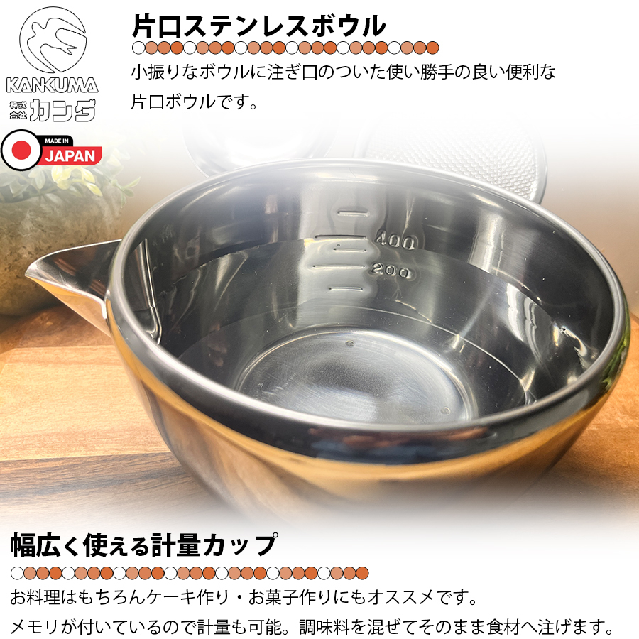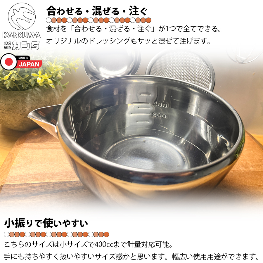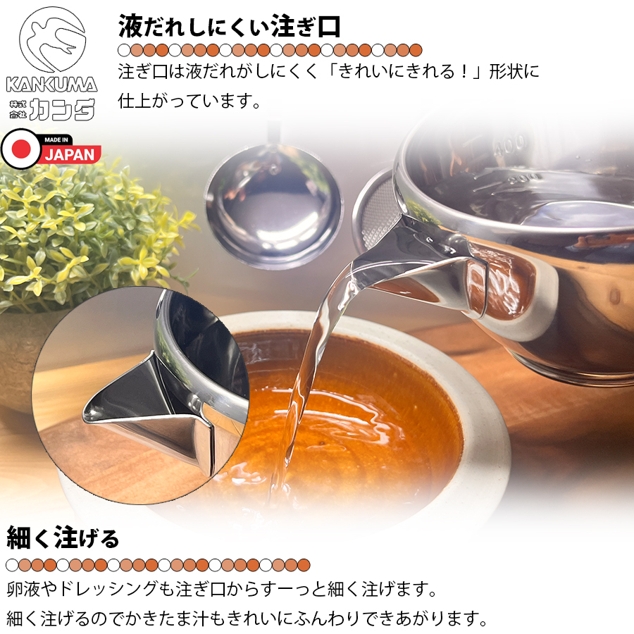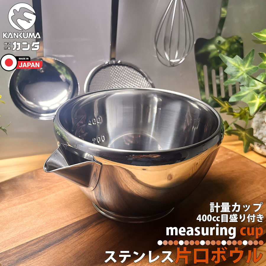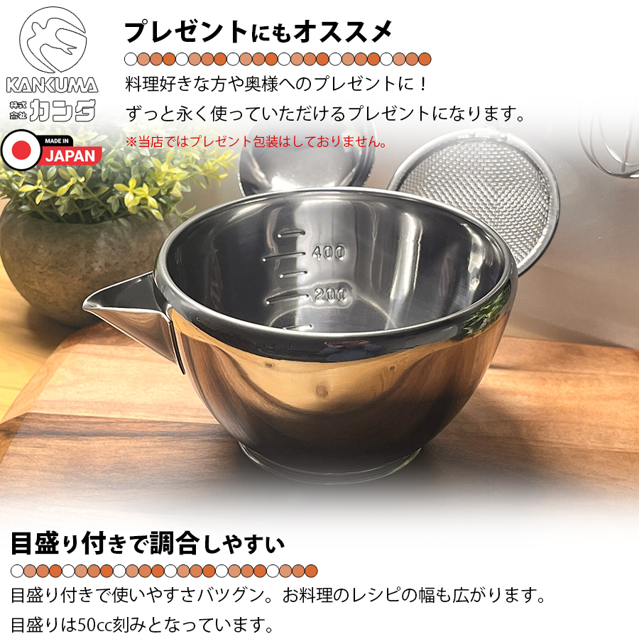 | ・「日本の食文化に調理器具で貢献します。」と公言する燕三条のカンダ。このアイテムはカンダオリジナル商品です。 ・使い勝手の良い小振りのボールに注ぎ口が付いており「合わせる」「混ぜる」「注ぐ」が1つで完結。 ・注ぎ口は溶き玉子やドレッシングなども液だれしにくく「きれいにきれる!」形状。 ・一般的な料理の他にケーキ作り・お菓子作りと幅広く活躍できるアイテム。 ・目盛付きなので計量カップとしも使用可能。 ・18-8ステンレス採用で高強度・高耐久。防錆性にも優れています。 ・各メディアで紹介された注目アイテムになります。 ・1点1点が燕三条の職人さんの手作りとなります。 |
