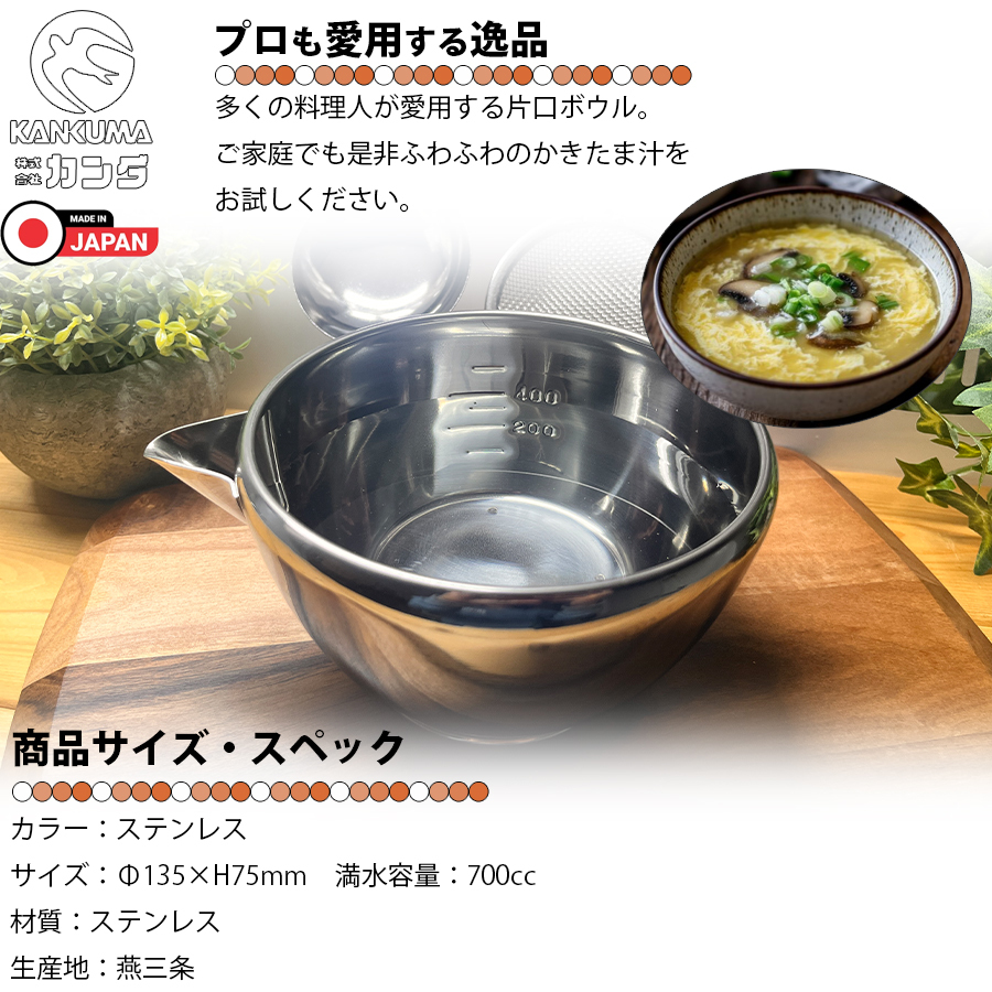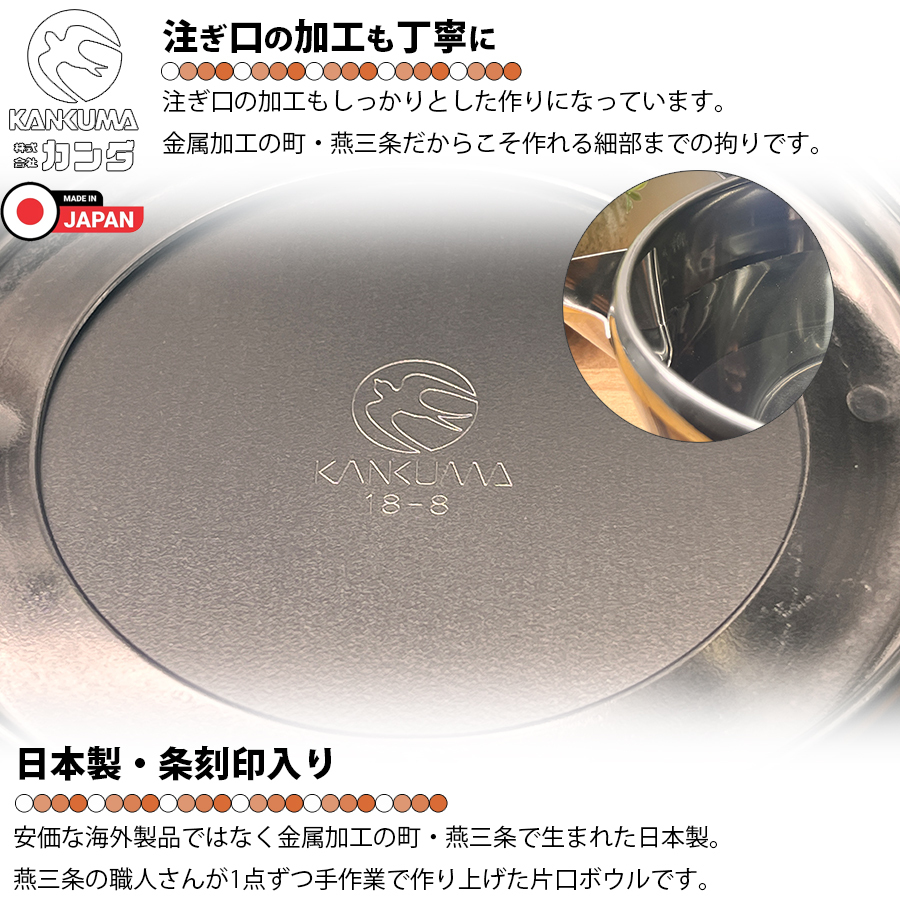 | 商品名:18-8片口 小(目盛付)(700cc) 材質:18-8ステンレス サイズ:約Φ135×H75mm・満水容量:700cc※目盛は400ccまで 生産地:日本・燕三条 |