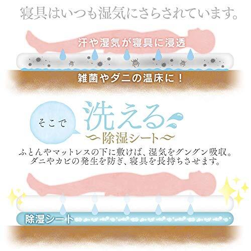 商品説明 | 【洗える除湿シートの5つポイント】P1、湿気をたっぷり吸収してジメジメ対策。P2、備長炭の動きで強力消臭効果!P3、汚れたら洗濯機で丸洗いOK!P4、干し時が分かるセンサー付き!P5、軽くて持ち運びもラクラク! 【湿気をたっぷり吸収してジメジメ対策】人間は睡眠時にコップで約2杯分の汗を放出すると言われており、お布団は1年中湿気を含みます。逃げ場のない湿気がダニやカビの原因となります。汗の多い夏場、さらに梅雨や冬の結露など、年間通した湿気対策が必要です。しっかり湿気を除去してケアすることが大切なのです。 【汚れたら洗濯機で丸洗いOK】汚れたらご家族の洗濯機で丸洗いできます(洗濯ネットをご使用ください)汗やダニなどの汚れを洗い流せるので、いつもスッキリ清潔で衛生的。何度もお使いいただけるコストパフォーマンスもポイントです。 【干すタイミングが分かるセンサー付き】湿度を教えてくれる吸湿センサー付き。吸湿量が増えると、センサーの色が青からピンクに変わり、天日干しのタイミング。干すだけで吸湿力が回復するので長くお使いいただけます。 【軽くて持ち運びも取り扱いもラクラク】軽くて薄いからどこにでも使え、敷布団に、ベッドに、押し入れに、カーペットになど、、干すときにも便利です。収納する際はコンパクトに折りたためます。