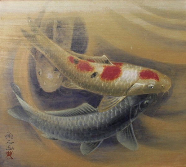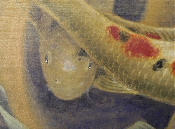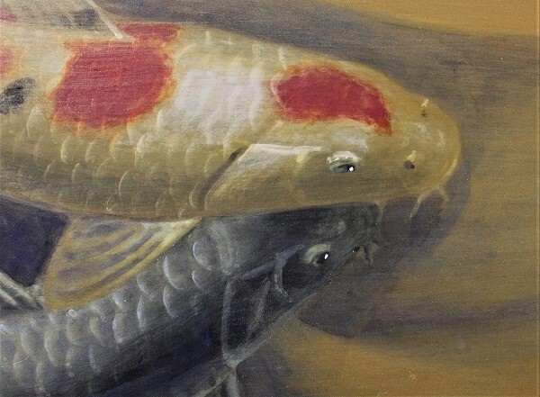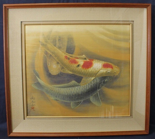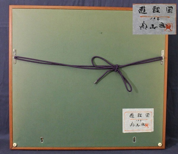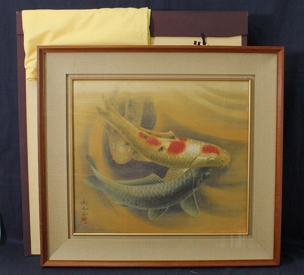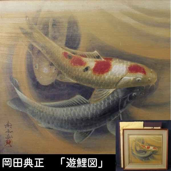 【真作】 岡田典正 「遊鯉図」 日本画10号 美品 額装/アクリル/共シール/黄袋/タトウ箱 D495