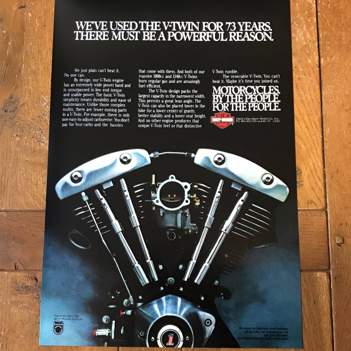 1976 Harley-Davidson Shovelhead USA 買付 限定数量 1976年のHD Shovelheadの広告がポスターになったものです。(当時モノではありません) ポスターサイズ:42cm × 29.7cm (額は付属しません。ポスターのみの出品です。額はA3サイズ用がピッタリです) こちらのポスターは高品質で厚みのあるアートペーパーに美しくプリントされたもので非常にハイクオリティなモノです。クラフト紙や布にプリントしたような粗い画質ではありません。存在感があり、しかも飾るのにも困らない絶妙なサイズですので、お好みのフレームに入れディスプレイするのにも最適です。また、しっかりとした厚みのあるポスターですので、そのまま無造作に壁などにピンでとめるディスプレイのスタイルもおススメです。 趣味の部屋・ガレージ・カフェ・ショップ・Bar・オフィスなどに! ※60's・70's・80'sを中心にマニアックな映画・旧車・バイク・音楽バンド関連などの様々なポスターを多数出品中ですのでチェックしてみてください! Click→映画関係ポスター Click→音楽関係ポスター Click→自動車関連ポスターA Click→自動車関連ポスターB Click→オートバイ関連ポスター Click→その他ポスター | ||