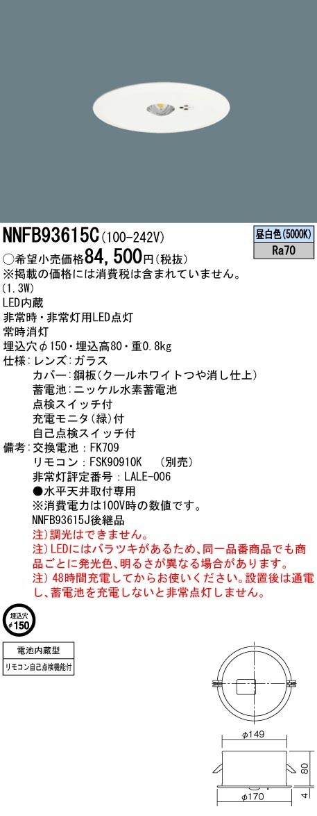 ◆天井埋込型、埋込穴φ150、30分間タイプ・LED中天井用(~6m)