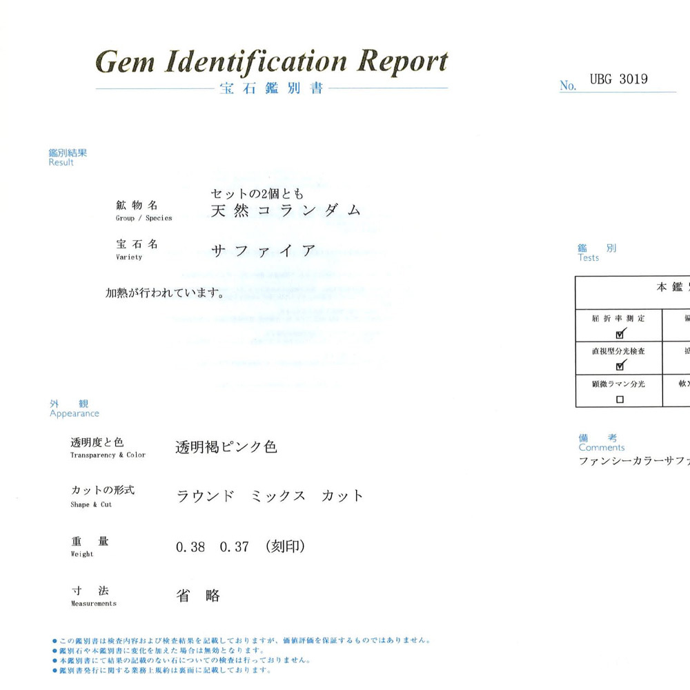 ● 石目:(サファイア)0.37ctと0.38ct(直径約4mm)