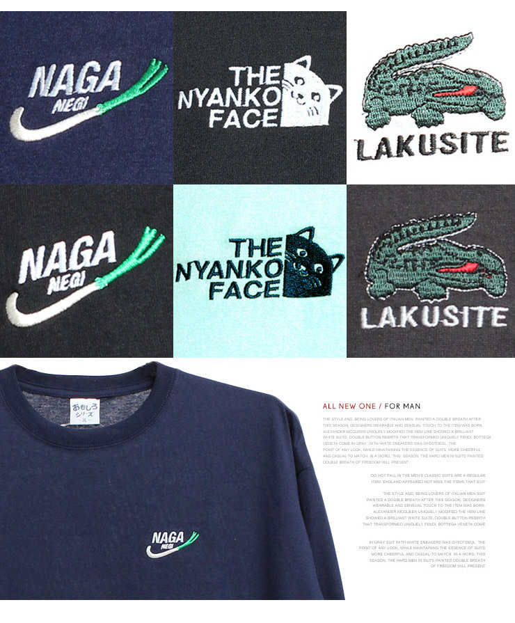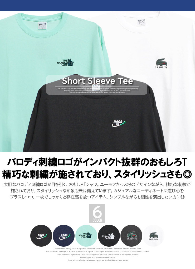 | 商品説明 | パロディ刺繍ロゴがインパクト抜群のおもしろメッセージプリントTシャツ。 |