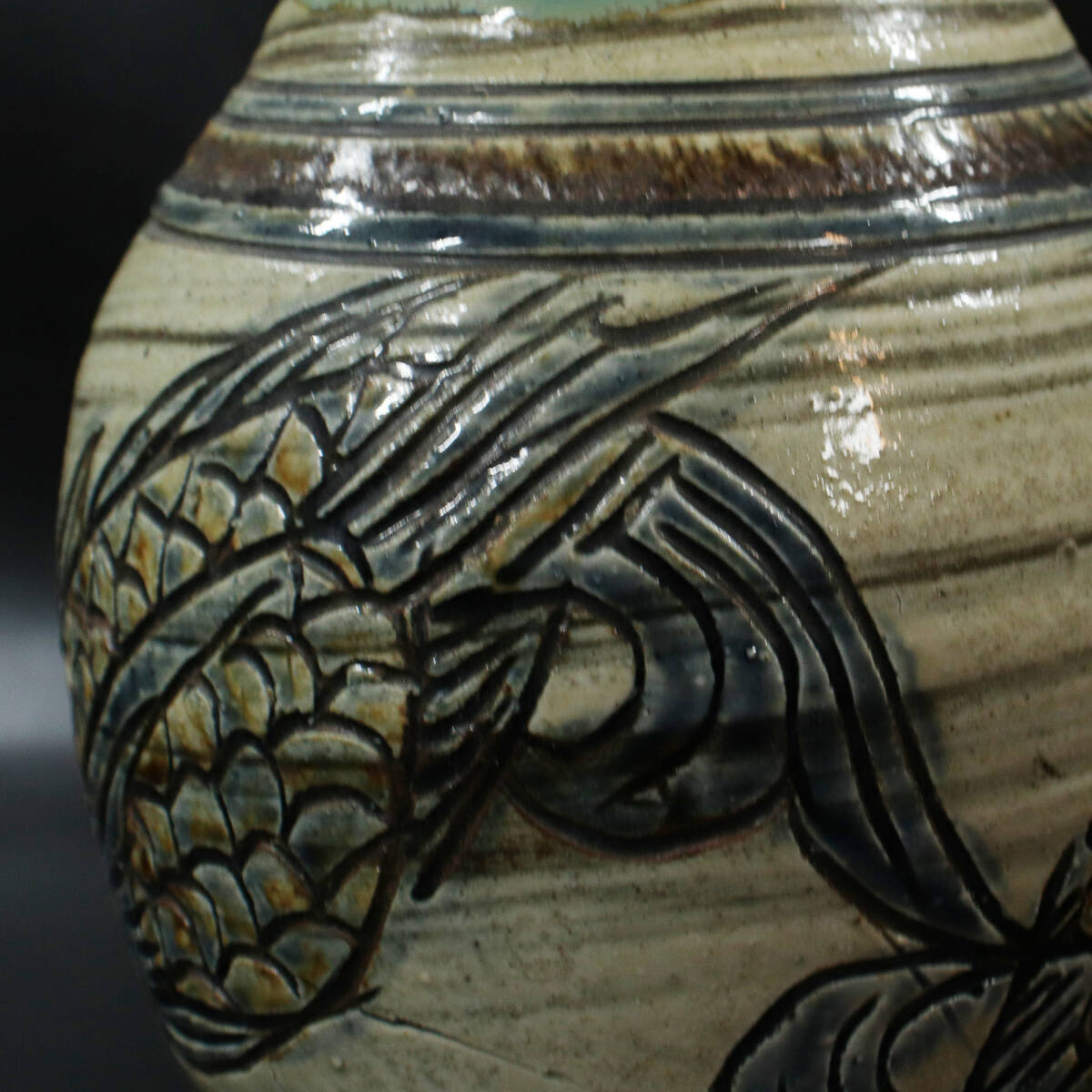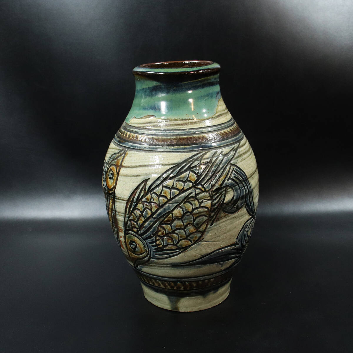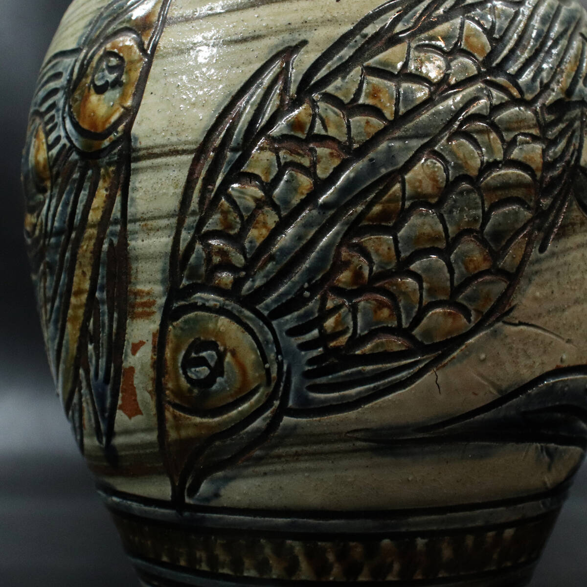 器の表面に彫り込まれた4尾の魚は、いっそ踊り出さんばかりの生命力と躍動感を感じさせる。