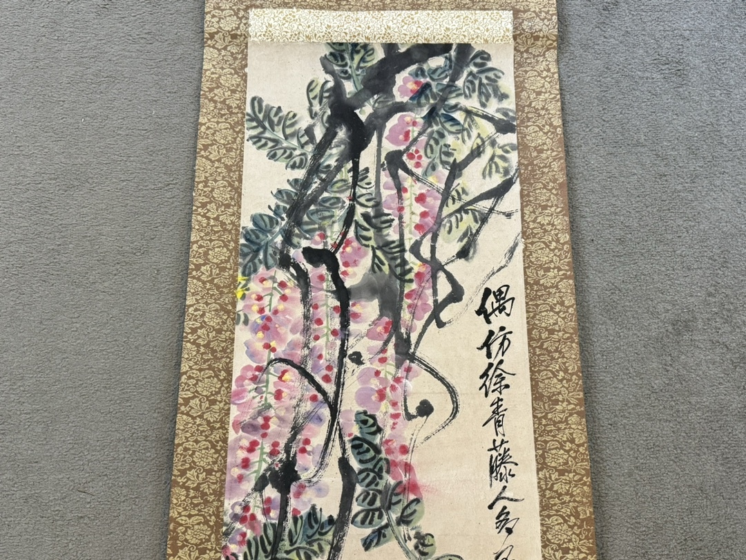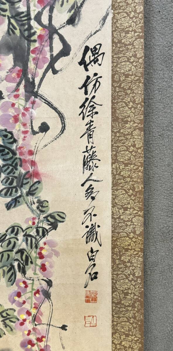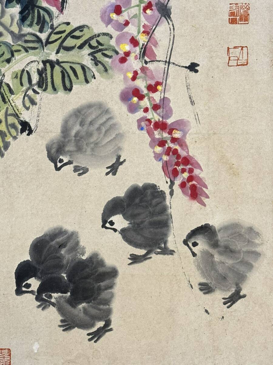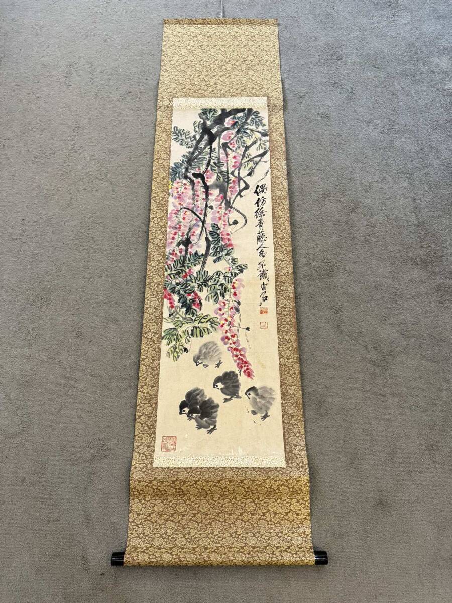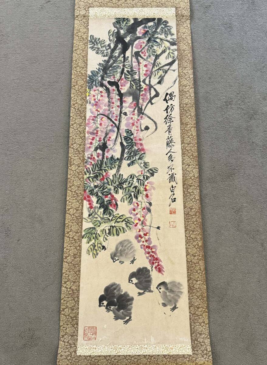 中国画 古美術 斉白石紫藤ひよこ図 掛け軸 真筆逸品 肉筆保証 中心尺寸116.5X33cm